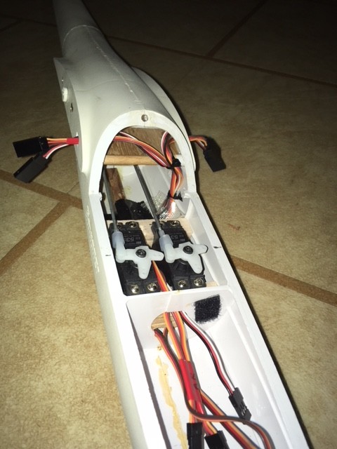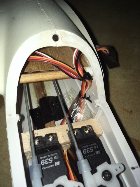All wires bundled to the right and cable tied to the dowel (don't think they are going anywhere). slots cut in the front of the fuselage