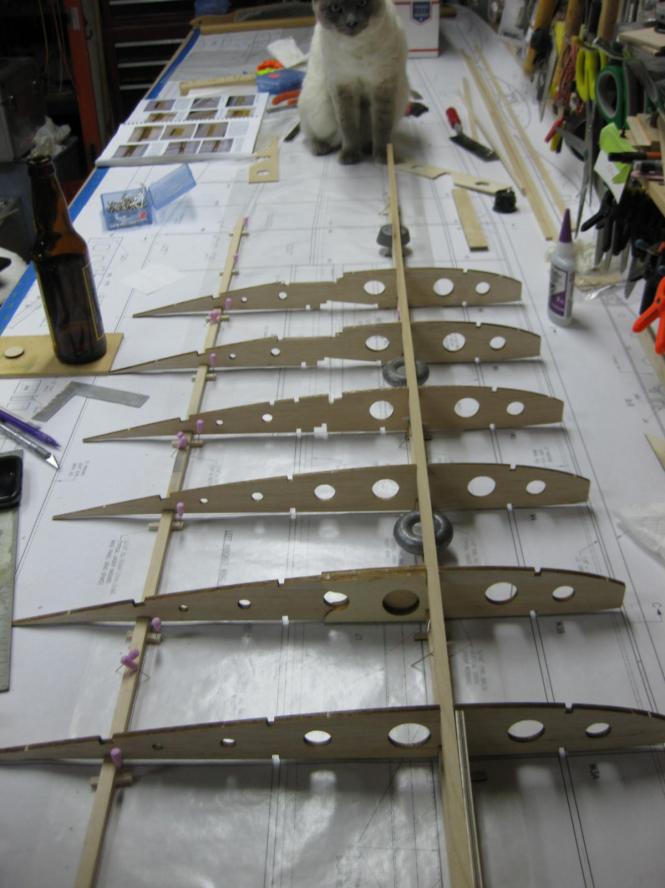 Apparently I forgot to order the 3/16 x 3/8 bass wood drag spar material so things came to a screeching halt.....Emergency Aircraft Spruce order.....good part is I can get 5' lengths for the tip section and I wont have to splice.....