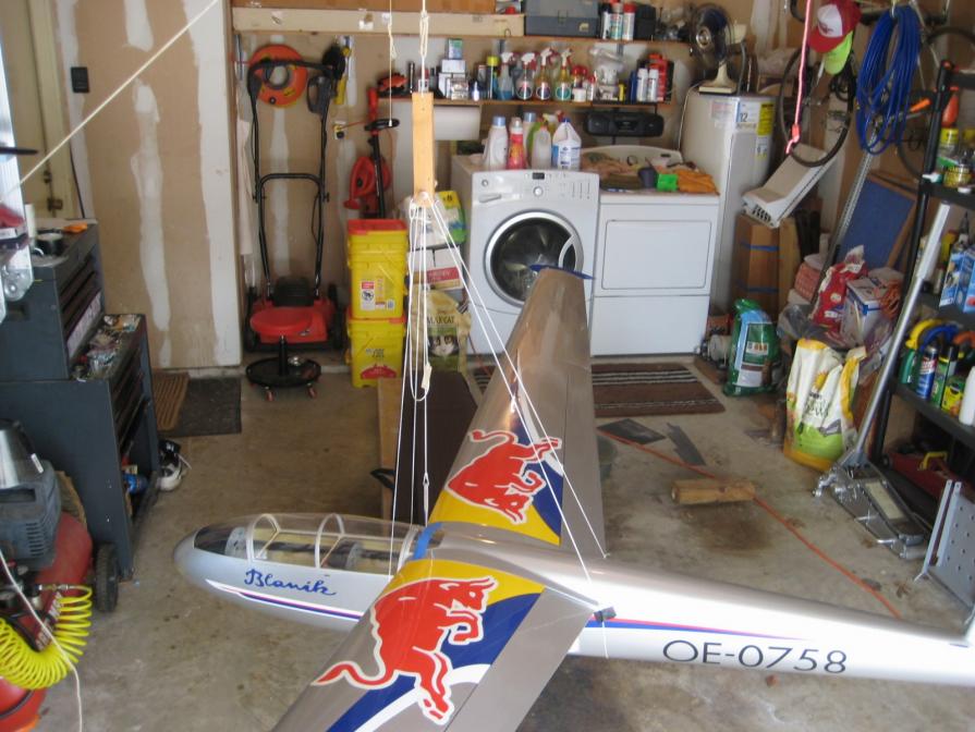 Now I just need to wait till our local aero tow group is ready to meet again. The paint touch ups will wait, we have had a bad spring for any work outside or flying not to mention painting! Since I had it together on the CG rig and the garage door open also took some pictures of it in the front yard. Will need a taller ladder to get a full span overhead shot. Will let you guys know how the maiden goes when that happens.