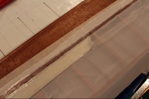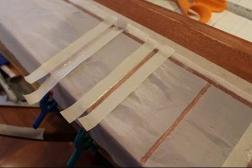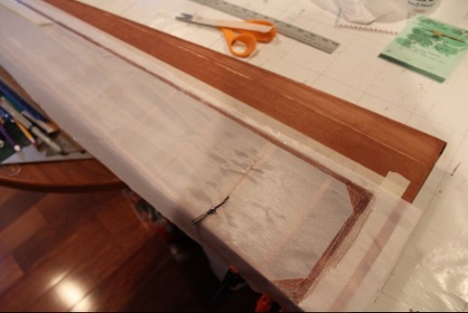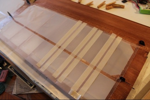 More covering pictures. This is the center section. Again, masking tape put down then Stix-It put onto structure. Covering put onto this and tacked down with an iron at 200 degrees. More masking tape put on it to keep the Stix-It tidy on the fabric. The lower surface has undercamber so the ribs received adhesive and tape, too. After the Stix-It dried a sharp X-acto blade was used along the outer perimeter edges of the masking tape. Then the fabric was tightened with the iron. Once the other wing panels and ailerons are covered, nitrate dope then varnish will be applied.