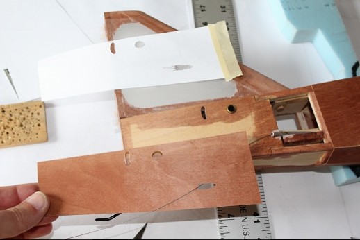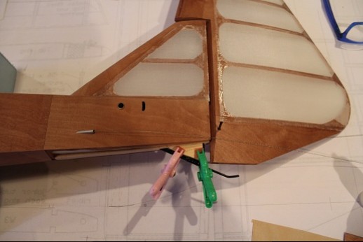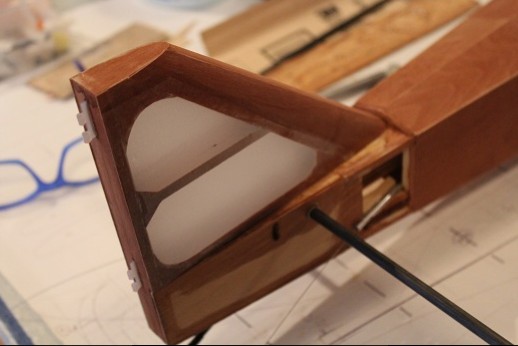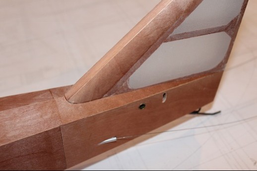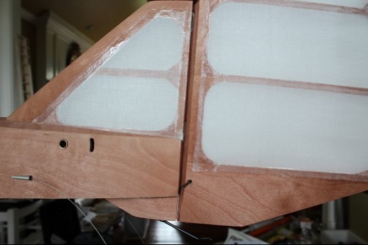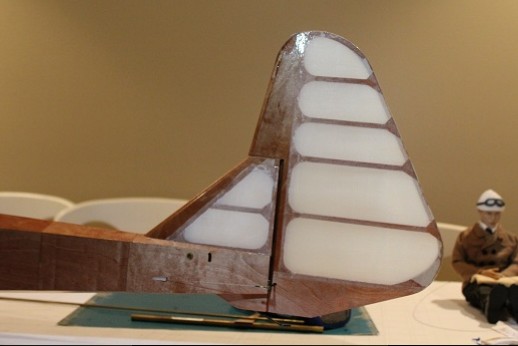 All the covering and nitrate doping is done! The fin was epoxied in place. A temporarily installed dowel segment sharpened in a pencil sharpener was used to locate where to drill for the peg that will secure the fin to the fuselage this end. Masking tape was used to delineate where Stix-It adhesive was applied. The bottom surface is concave so it is very important to get the fabric properly attached. The 'Dope Spreader Tool' is shown. Put a little dope onto the structure to 'prime', lay down the dope spreader tool then slather dope onto the tool as it is dragged across the fabric. The dope gets put onto the fabric really fast and none gets pushed through the fabric to pool. I put three coats of nitrate dope onto the model this way. Next to do is finishe the ply sheeting around the fin. Stay tuned!
