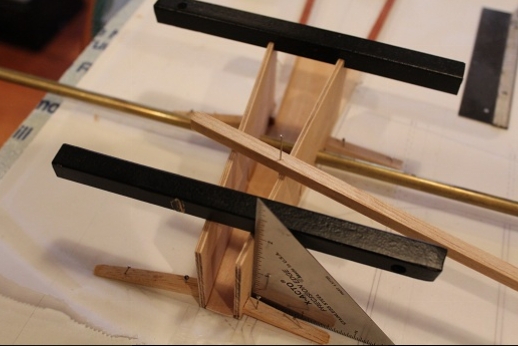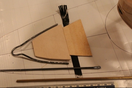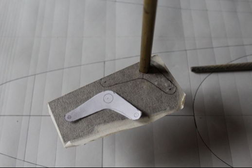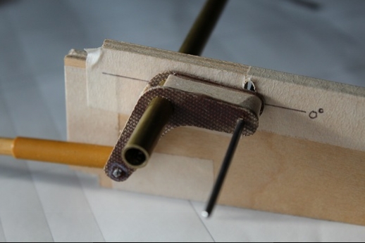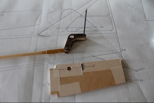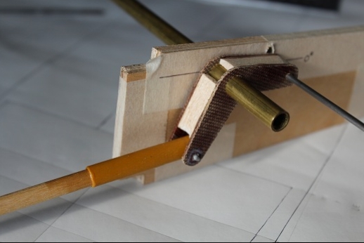 The elevator is an all moving 'pendulum' type. The mounting has to be robust and fluid with no slop. The stab will be built around a 0.25" CF tube pivot spar. The spar will be an interference fit in aluminum tubes within each stab half. This spar will be carried by a brass tube bushing in the fuselage. The tube ends were de-burred. The CF spar is removable for inspection. The elevator horn is built up from two micarta parts with balsa spacers. I drilled the large hole in each one first then fit them onto the brass bushing. Once satisfied with the fit they were cut to an 'L' shape on the band saw. The other two holes were drilled while the horn were stacked together on the bushing then they were sanded fair relative to each other. I epoxied balsa spacers between the two horns. The reason was I wanted the stab halves to not have any chance of becoming misaligned relative to each other. Probably overkill. I made two fuselage parts from 0.125" marine ply that carry the bushing. A pin from the horn will fit into tubes in the stab. This pin goes through an arc with elevator control input so I used the pin as a stylus via the horn to mark the masking tape on the ply. Then the arc slot was made using drills and small files. The pin will be epoxied in place, later. The pushrod end of the horn has a plastic bushing through which a small wire passes. The pushrod has a fiberglass tube on its end. The plastic bushing is an interference fit on its end. When these parts were assembled then the wire ends were epoxied to the horns.