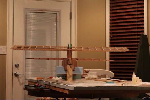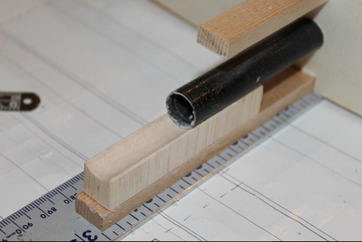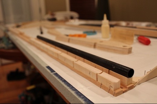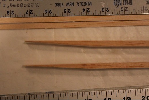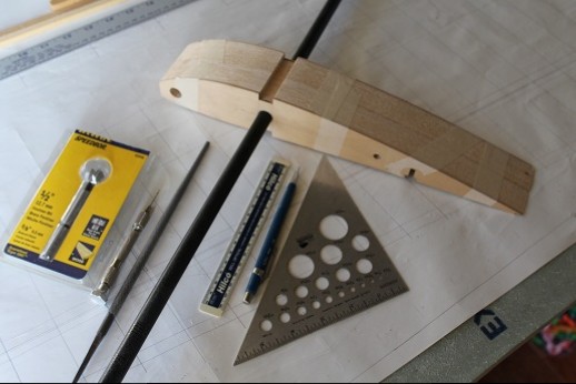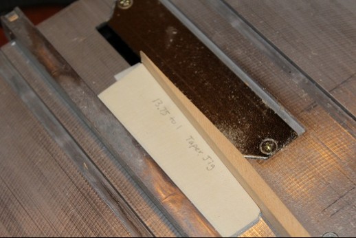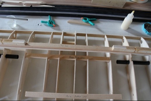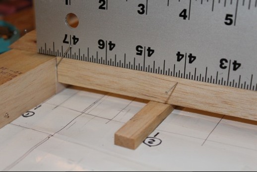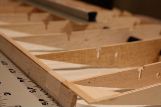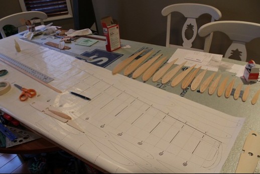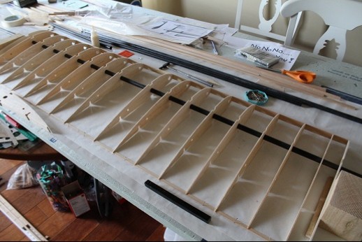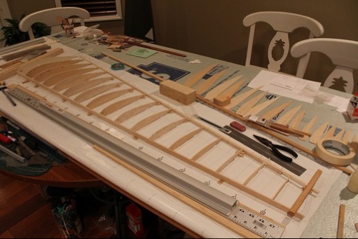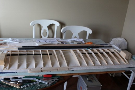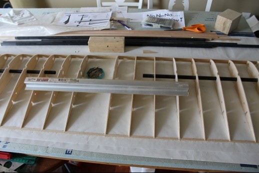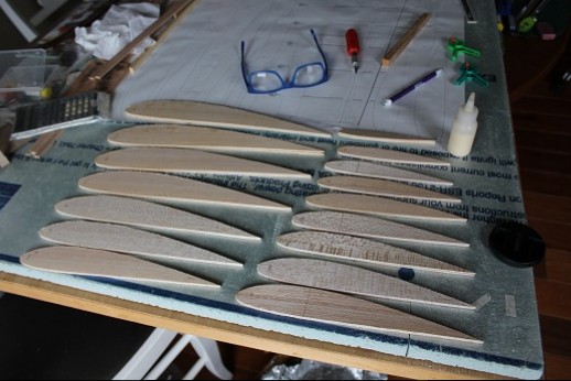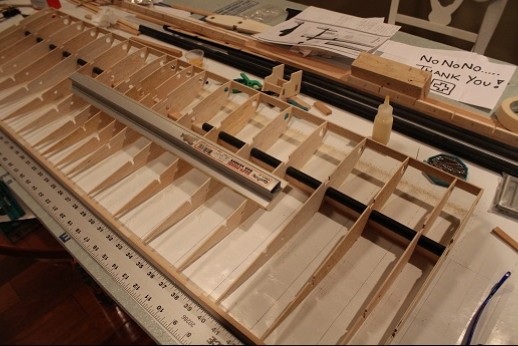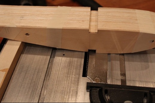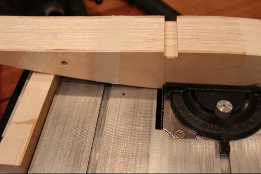 These next pics are pretty boring but is what is needed to be done to prepare for the wing build. The center wing of the three panels will get built first. All three panels will have a 'D' box LE and the rear spar will be flush to the bottom surface and it will have an inverted 'T' section. The bass TE and center section spruce spars were cut to length. The stack of ribs were taped together and trued using a 'T' bar sander. The TE and spar locations were marked then they were cut using the table saw. The upper spar notches required that packing be put on the table of the saw to maintain alignment. After this was done a 1/2" hole was drilled so the CF sockets and joiner tube will fit. The hole was slightly enlarged using a rat tail file so the CF socket would fit. I think it is a 'metric' item. They'll get nice packing so that epoxying them together with the spars and shear webbing will create a nice unit that should be stout enough for vintage style flying. (Did you like my wording TomP?