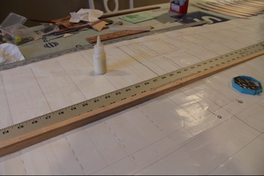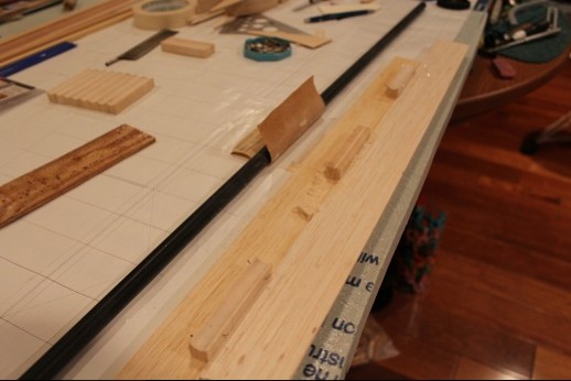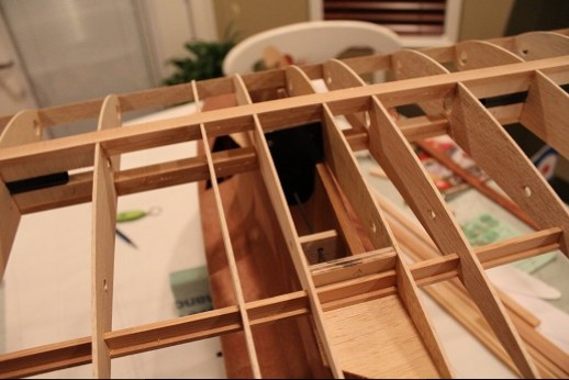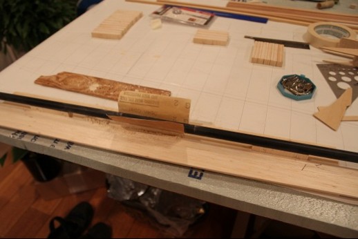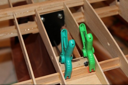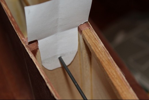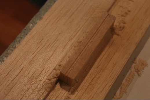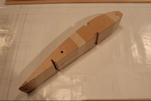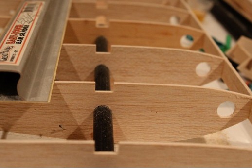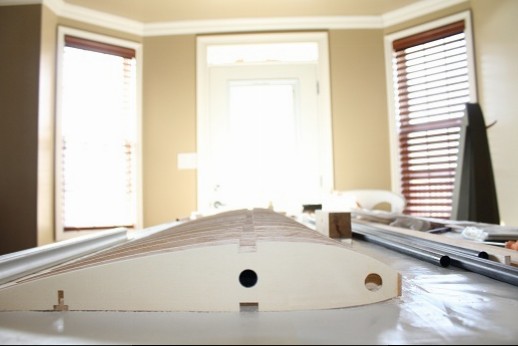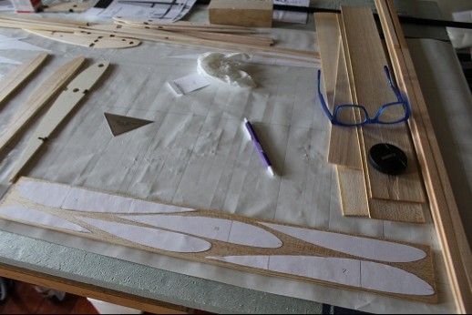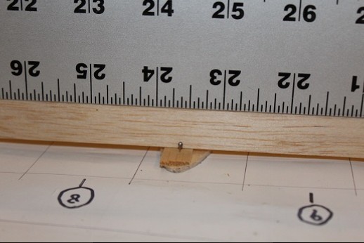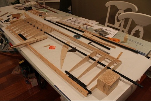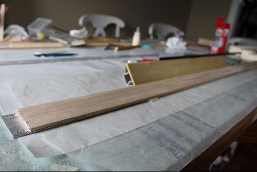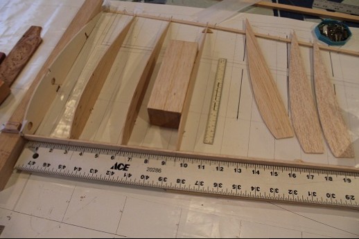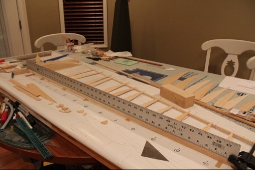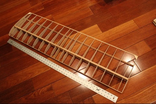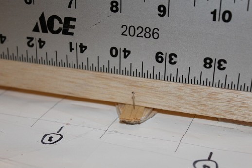 These next pics are pretty boring but is what is needed to be done to prepare for the wing build. The center wing of the three panels will get built first. All three panels will have a 'D' box LE and the rear spar will be flush to the bottom surface and it will have an inverted 'T' section. The bass TE and center section spruce spars were cut to length. The stack of ribs were taped together and trued using a 'T' bar sander. The TE and spar locations were marked then they were cut using the table saw. The upper spar notches required that packing be put on the table of the saw to maintain alignment. After this was done a 1/2" hole was drilled so the CF sockets and joiner tube will fit. The hole was slightly enlarged using a rat tail file so the CF socket would fit. I think it is a 'metric' item. They'll get nice packing so that epoxying them together with the spars and shear webbing will create a nice unit that should be stout enough for vintage style flying. (Did you like my wording TomP?