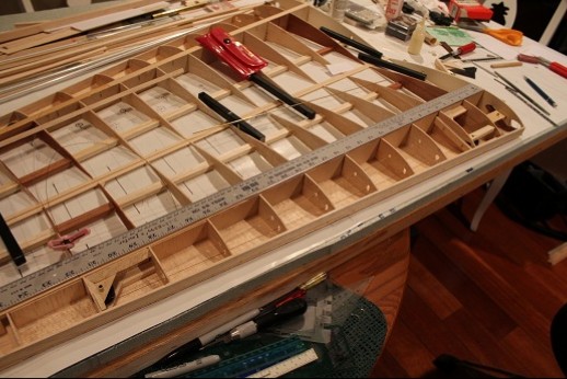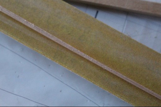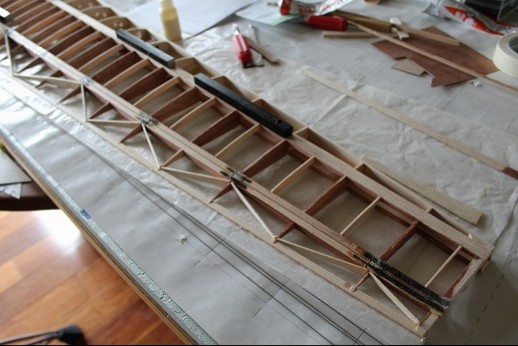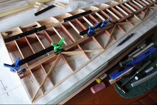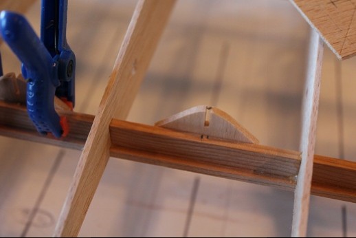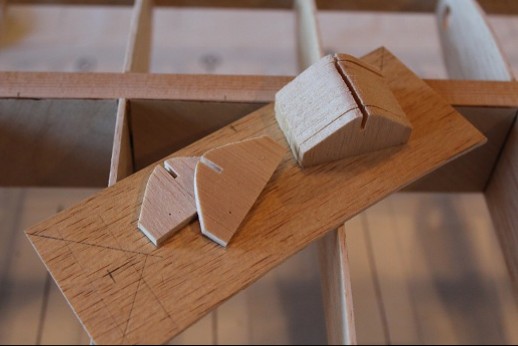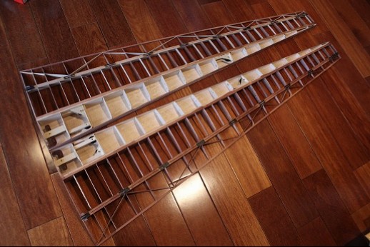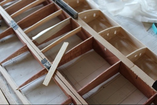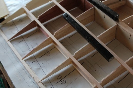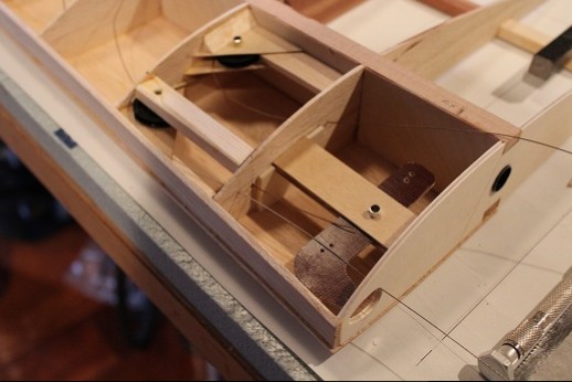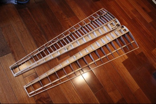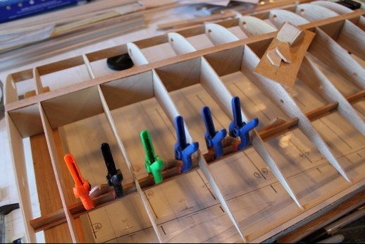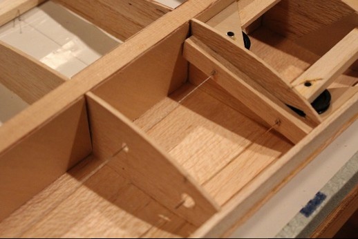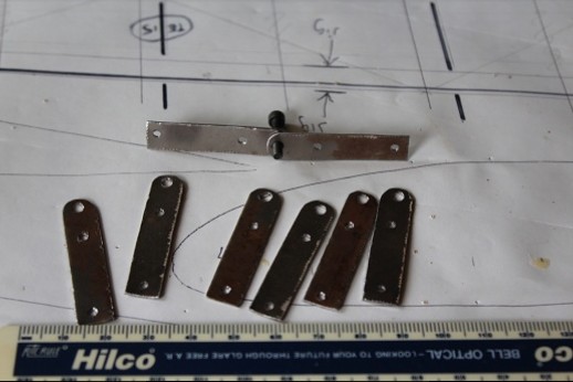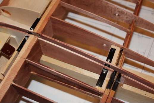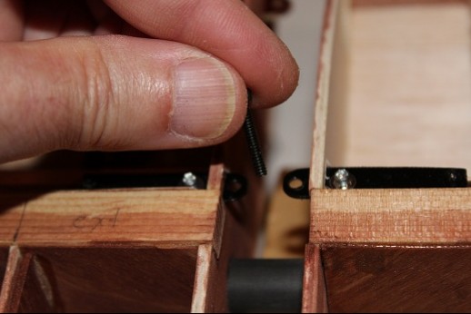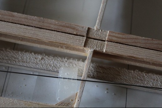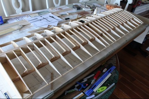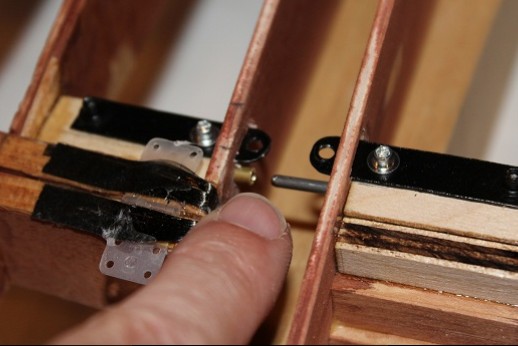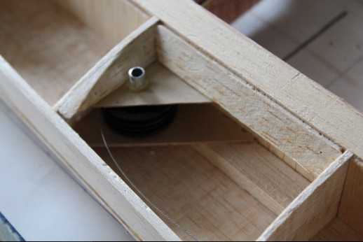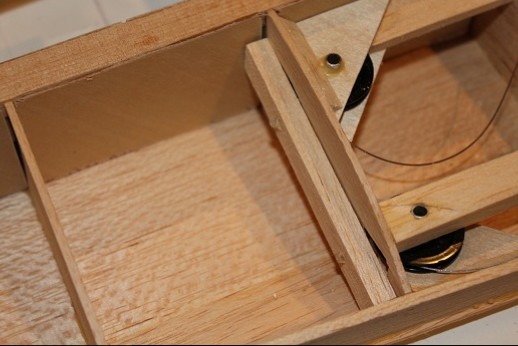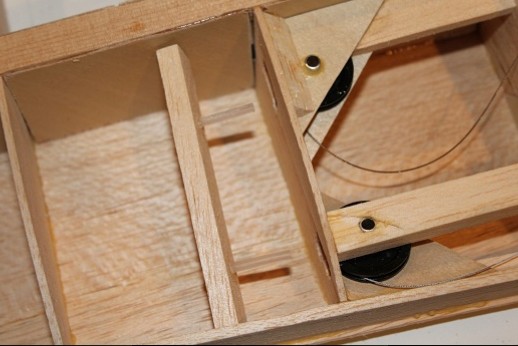 All of the shear webbing has been installed! Whoopee! That was a bit of a boring job. I was going to actuate the ailerons via a torque rod with cranks to drive cables to the aileron horns but there isn't enough room for the outboard cranks inside the 'D' box portion of the wing. The ailerons have two set of horns connected to cables. One is only 3 ribs over from the outer panel root end and the other is 11 ribs out. So... pulleys and cables will be used... just like full scale! Waddayaknow! A lot of time was spent running dummy cables to get the lead outs or ferrules installed. 1" diameter pulleys were used. The outer aileron horns have pulleys stacked one above the other and the inboard ones have them separated. The last two pics not only show the inner end pulleys but the outer ferrules pre- and post- installation. More stuff has to be done but I spent a lot of time on these little details!