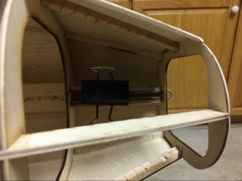 Note the saw cuts we made in the top fuselage spruce stringer in order to get the necessary flex to bring the sides in to the front bulkhead. We also used water to wet the plywood fuselage sides to assist with this bending process.