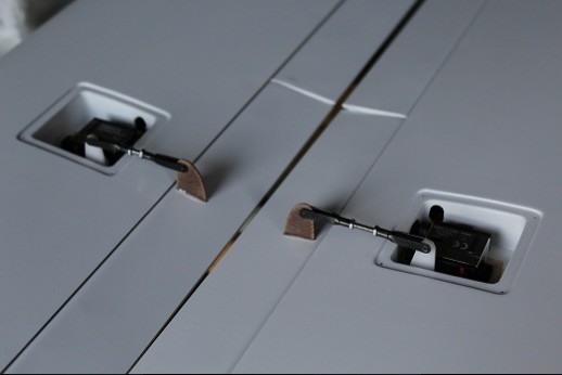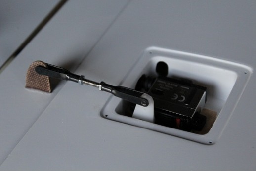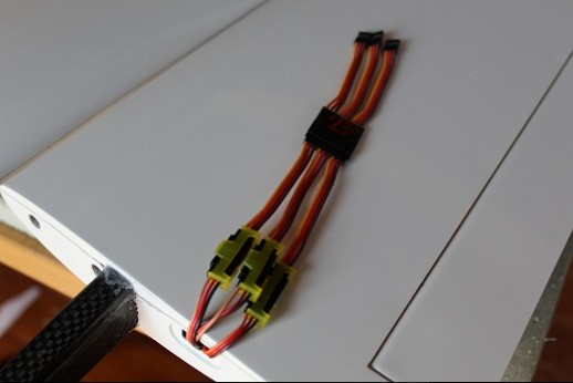 Stéphane posted a link to www.Gibbsguides.com in his ASW20 thread showing how to set the retract to operate on a separate battery. I couldn't get the image to copy so just drew another and took a photo to post here. On the 'Y' lead I just pulled the red pin out, folded it back and put heat shrink tubing on it. That's one more detail checked off the list! The aileron servos were installed into their bays. A weighted cable was used to pull a string through the wings so the servo extensions could be routed. This had to be done a total of six times! All connections were secured with EMS Safety Locks. They aren't found locally so The Model Box 2.0 is my 'go to' for these! Thanks Jeremy! Horns, slots and push rods were made just like for the flaps so nothing new there. The three servo leads per wing are ganged to these connectors from Electro Dynamics. They have a safety catch which has to be pressed in order to unplug them. The servo bay covers need to be fabricated (or the kit version might be modified). That is next. The kit horns will be installed along with their 'bulges' on the top surface of the wings since these are in 'scale' locations and if there happens to be a second owner of this model they will be free to revert to the kit design/configuration.