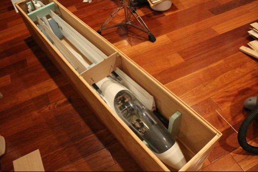 The box pic isn't very good. The wing servo bay covers need to be put on the model. They need to be slotted to clear the servo arms. Tomorrow the box will get blue foam inserts to hold the fuselage and wings. Stéphane is going to bring some servo lead extensions and help me set up the radio so that is all that is needed before test flying at Sled Works!