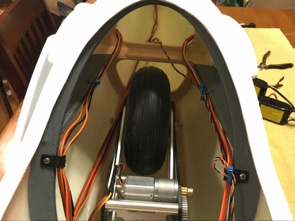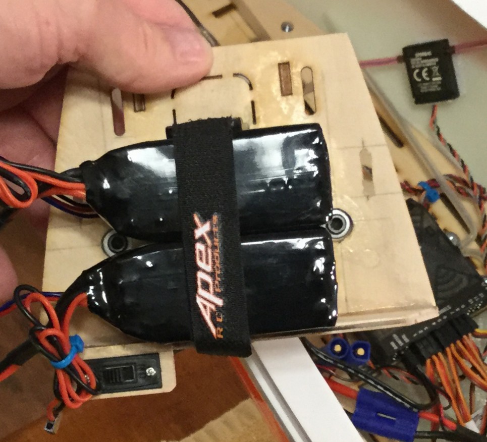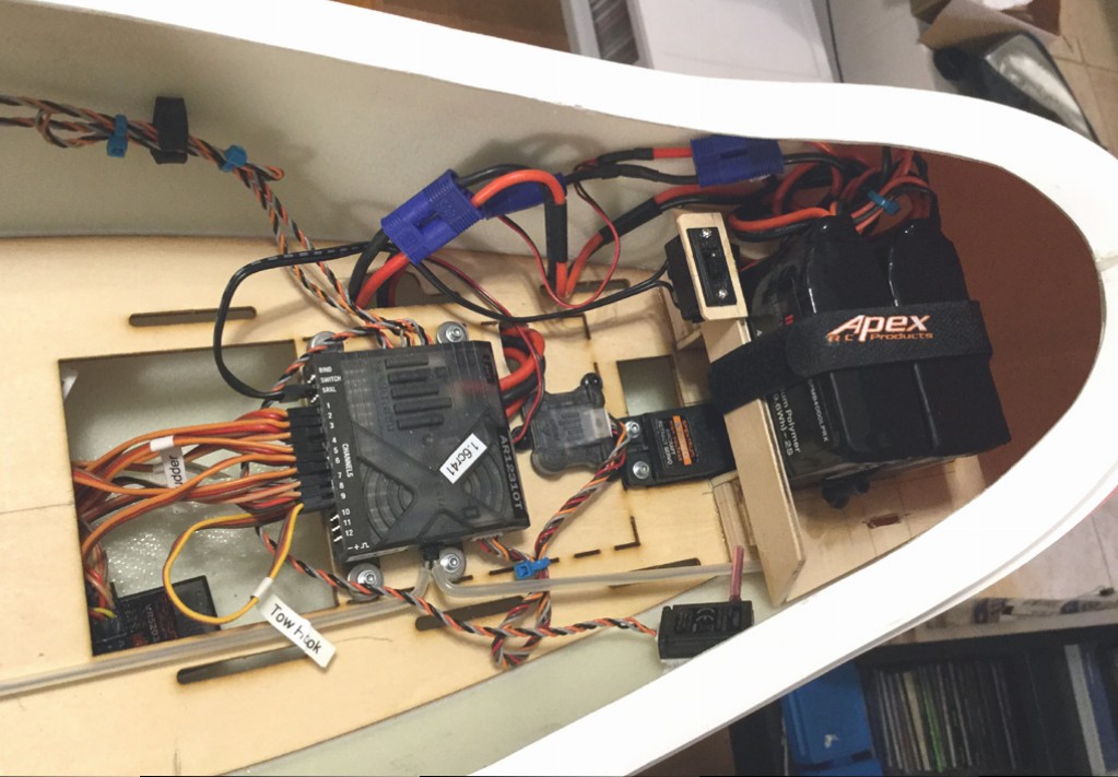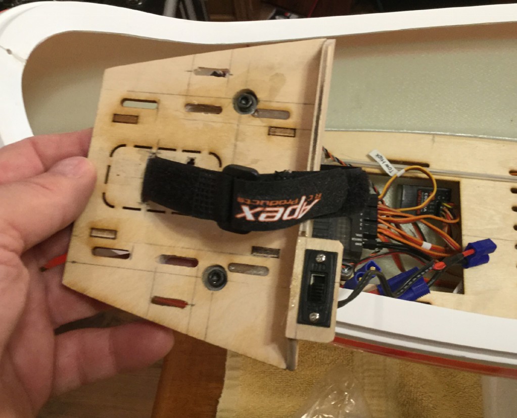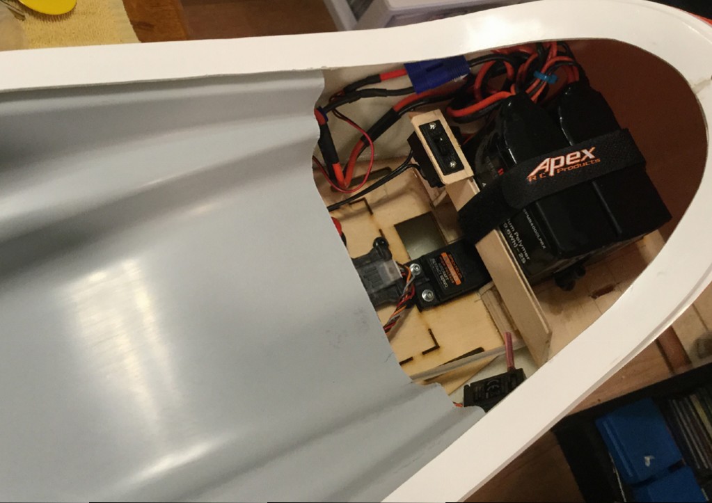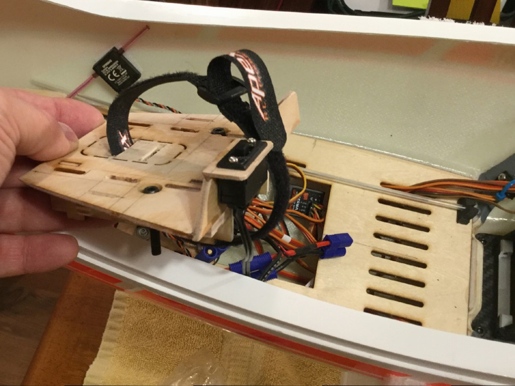 I made the little shelf removable in case I need to access the tow release servo, which I oriented further forward. I also like to have easy access to my receiver. Voltage regulator velcroed to the bottom fuselage. Cockpit tub fits in very nicely.