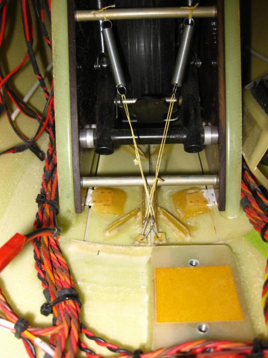 Landing gear doors "guidance" plates installed so the doors won't bind on the landing gear as it cycles. 1.75"x 0.25" springs (0.020 wire gauge) and Kevlar thread for keeping the door closed.
