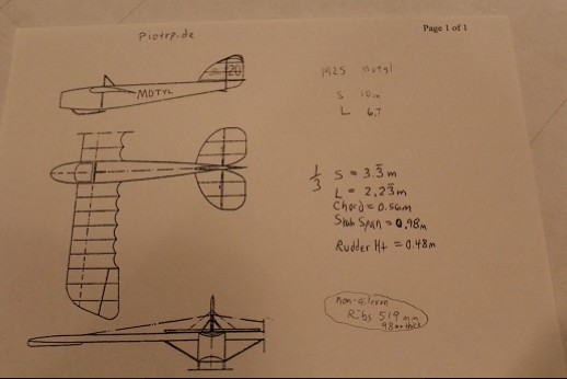 The 'Motyl' (Butterfly) was built in 1925 to the design of Michal Bohatyrew at the Fachzirkel der Machinenbauschule in Poznan, Poland. It had a 10 meter span and was 6.7 meters long. Not much is known of it and I've only seen one photo and one three view. So... if any viewers from Poland or anywhere else have more information please correspond! I'd like to know what color to make it, too. If I could find out the most common butterfly in Poland and its color that might do splendidly for this 'Motyl'! Because of the scarcity of information my job is made a lot easier! I can build the model pretty much how I want. So long as the 'spirit' of the full scale is maintained I will be happy!