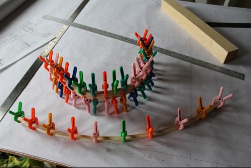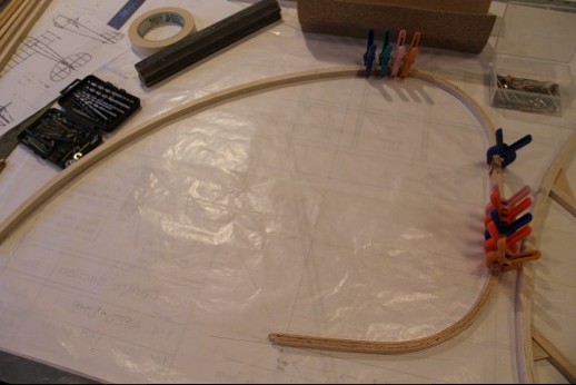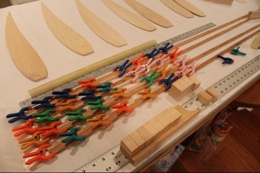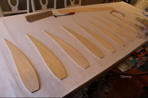 Znowu ja! The aileron curved tips were sanded to smooth them out but they will need to be tapered in thickness, later. All the ribs were cut out and their noses were trimmed to receive the false LE. The two outermost aileron ribs were blocked up on their TEs to account for washout as they were pinned to the stack for the nose job. The false LE will lay squarely against them by doing this and not be twisted. 3/32" balsa Laminates for the swept portion of the LE were soaked in hot water then put on a form to dry. They get glued later. All the ribs are shown at their stations. There aren't many!