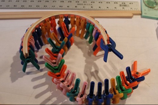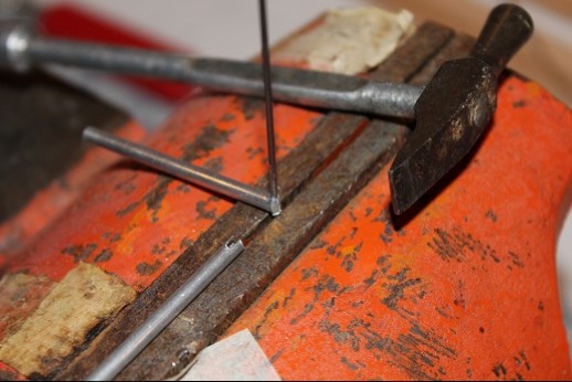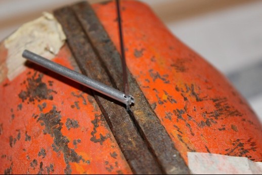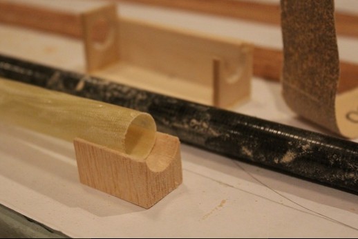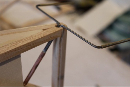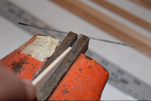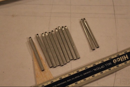 The tubes were squeezed in the vise to the thickness of the ribs. In the last picture the two tubes on the right have their pass-through holes at an angle. These are the ribs next to the ailerons which are a little longer than the others.