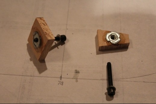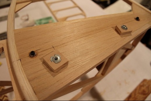 Dobranoc! I put the elevator horn in position so you can see the clearance needed at the fin post. The fin and rudder are done. The stab was aligned then pinned onto the fuselage then the mounting holes were drilled. 6-32 bolts and 'T' nuts will keep the stab in place. The 'T' nuts were secured with 30' epoxy at their surface and onto the stab mount plate. The bolt heads are proud of the surface so the fin's bottom edge was clearanced for these. Next, pilot holes were drilled into the stab and through the fuselage. The holes were enlarged in the stab and fuselage to fit aluminum guide tubes for wood dowels located in the fin. What was done was to dry fit the tubes and pin the fin to the stab then push a sharpened dowel segment up through the tubes and into the fin's base. This provided a 'punch mark' guide for drilling the fin to receive the dowels. Then all was taken apart, glued then re-positioned for the glue to dry. What is neat about this set-up is the aluminum tubes are proud of the stab mount surface so the stab can be placed in proper position easily then its bolts screwed in place without fiddling around for alignment. The wood dowels glued in the fin are long enough so the fin LE won't 'rise up' at speed. Cables and turnbuckles will secure the tail feathers relative to each other. Split pins will allow easy disconnect for dis-assembly as is done for the Vampyr and Eaglet.