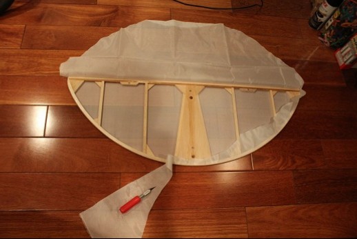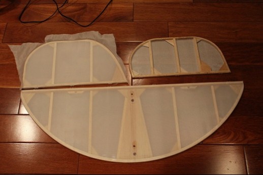 I can't start the wings until the Aircraft Spruce cap strip stock order arrives so I started covering the tail feathers. Sig Mfg. Stix-It was brushed on the perimeter of the structures then Koverall was attached using iron. The pics show some stages of the process. Use sharp blades to remove the fabric. To avoid the 'fuzzies' Stix-It was brushed onto the fabric at the edges and allowed to dry before the fabric was trimmed. I used a lot of leftover Koverall so that has been saving some $$$!