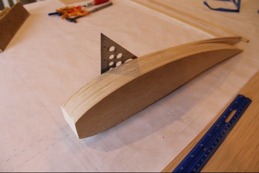 Znowu ja! The hard points were glued into the stab. Two are to mount the stab onto fuselage and two are for cables to attach. The cables and turnbuckles will get set up later. The fin and rudder outlines are made up of laminations just like what was done for the stabilizer and elevators. The wide one was cut in half length wise to make the two rear-most rudder curves. After the outlines were scarfed together and re-inforced with 1/64" ply at the joints the internal structure was put in place along with gussets and a rudder horn mount. Everything will get sanded fair once the glue has dried. The alignment pegs will get glued into the fin's bottom surface and corresponding holes will receive them in the stab.