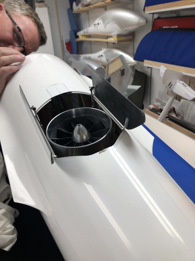 This JS1 is fitted with an up and go 120mm EDF turbine unit. We're powering the EDF with 14s 6000mAh packs. We have determined we can get about three minute out of the packs, which is actually a long time when you're only using it to climb.