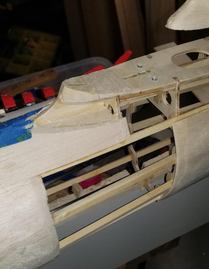 Stab platform area is a real joy to sheet. I added an extra piece of balsa half way up for the sheeting to attach to. Then more solid balsa that can be carved will be glued above that at the front of the stab mount.