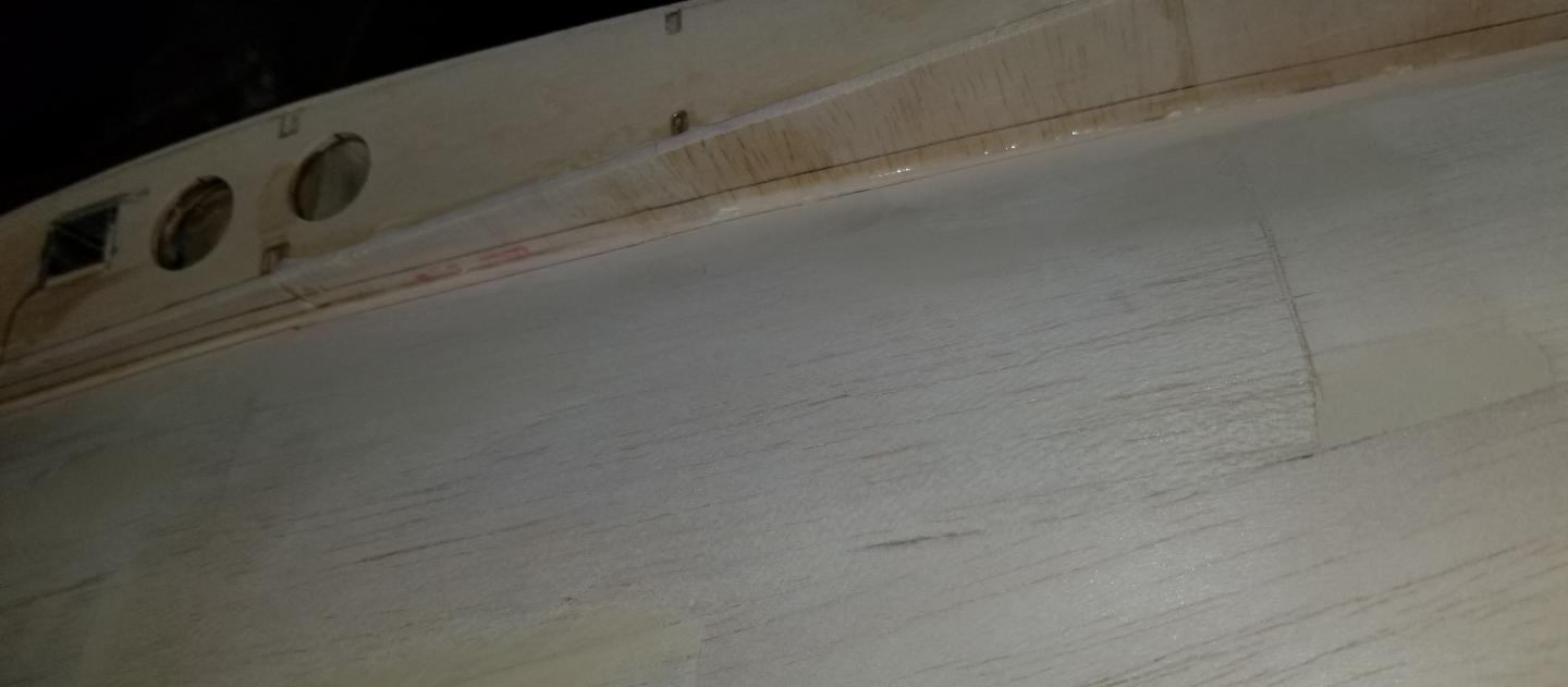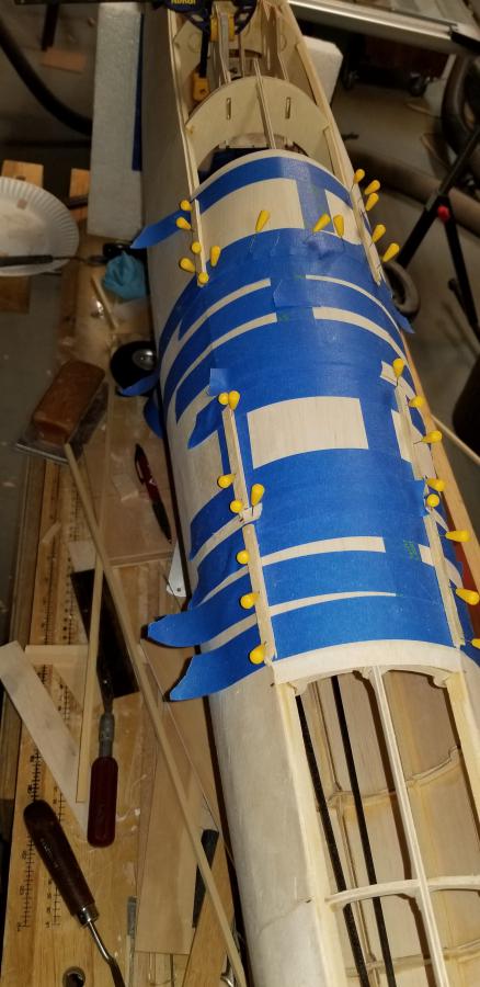 Joiner boxes and pin are now all glued in. Epoxy with milled glass added for additional fillet. The wing joiner was actually right against the fuse wood parts on two sides with shims on the other two sides. So without epoxy they were in place. The extra epoxy probably wasn't necessary. Still it's a fuselage I would worry about hitting a tip. Top sheeting here will be a place to use the one c-grain sheet of balsa I have from the pack. Near the front of the wing, there is some level sheeting to the first curved ply strip. Starting there and over the rest of them, sheeting will follow the rounded shape of the fuselage.