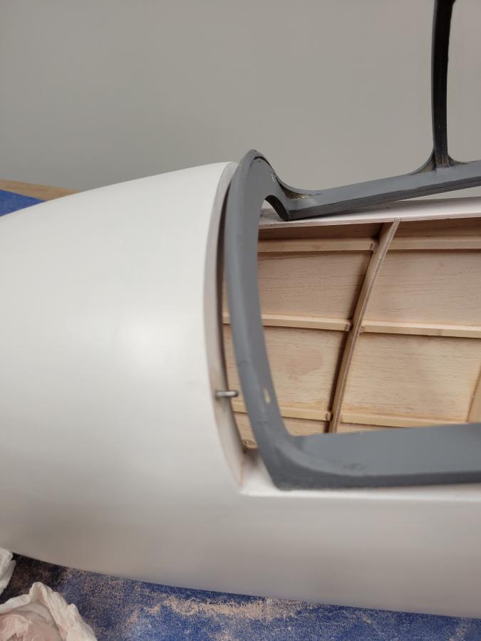The front of the canopy can be some pins. I glued in two 3/32 dowel pins into the fuselage. The frame can be tilted to slide onto the pins.