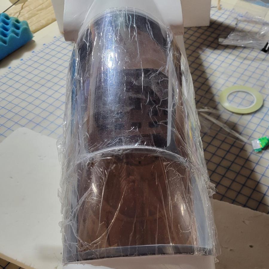 I made some side panels for inside the cockpit with fiberglass. I gut some pieces of mylar a little longer than I needed. I used some old pieces of mylar from some wing I bagged long ago. The mylar was waxed with Meguirars Mold Release 8 and then a coat of primer. I guess Meguairs sold the #8 product to Stoner. I masked the side sides of the fuselage so that I could use that to hold the mylar and glass while the epoxy cures. It would be fuselage / tape / mylar / glass / release film for the layup. That way the smooth side off the mylar would be shaped for the inside of the cockpit. I used one layer of 1.4 glass, tjhen a layer of 2 oz glass and another one inch wide strip of 2 oz glass to apply to the top edge as well as a strip near the front and near the back to help the glass keep shape. The glass was wet out with MGS Epoxy and then I put a layer of release film over that. The release film lets you squeege the glass a little more while wet to work out any air bubbles. I trimmed this all down to the size of the mylar and then taped the mylar to the sides of the fuselage.