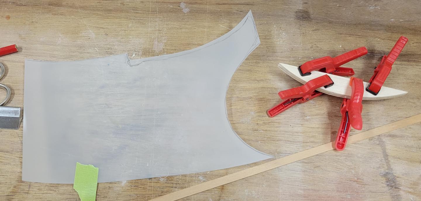 I used some drafting mylar to trace the area for the sheeting in the back. The tail skid is just a simple outline, simple and light weight. The simple outline is what is printed in Martin Simons 3-vew drawing. Pictures I have collected from the Internet have other variations.