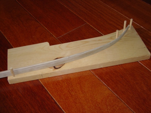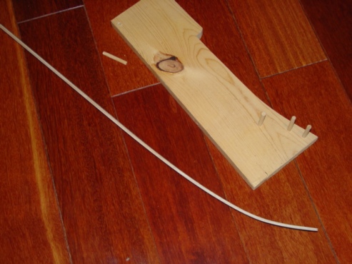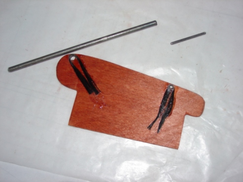 More varnishing! Beauty! The covering goes from white to translucent with application of varnish. Skid made from Ash, soaked in hot water then placed on a jig to dry. Don't use any ammonia unless you don't mind embrittling the wood! Allowances made for spring back. Making parts to attach skid to fuselage. The 'O' ring shock absorbers made from auto hose. The white threads in the tubing were colored with a black ink Sharpie pen.