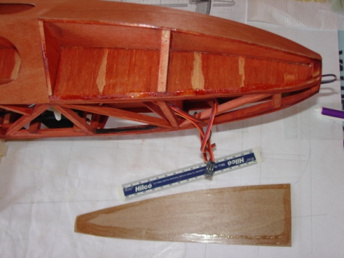 Lightening the tail. This saved a few grams. Every little bit helps! Fitting more 1/64" ply using contact cement. Special 'scoring' cut in ply to fit elevator LE. The same was done for the rudder. The ply was extended over the gap to create a shroud on the fin and stabilizer. A wheel collar was soldered to a tab then this assembly was glued into the stab. When the stab is put on the fuse the grub screw on the collar can be tightened to keep the stab in place. A small access hole was drilled through the ply for the Allen wrench. The Allen wrench can be seen in action in the photo. Don't you just love action shots!?