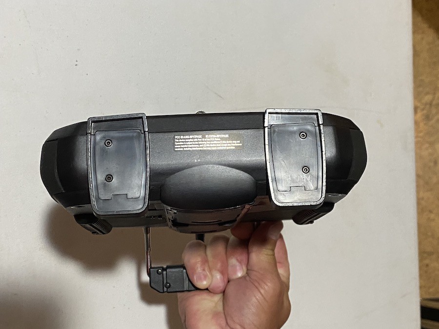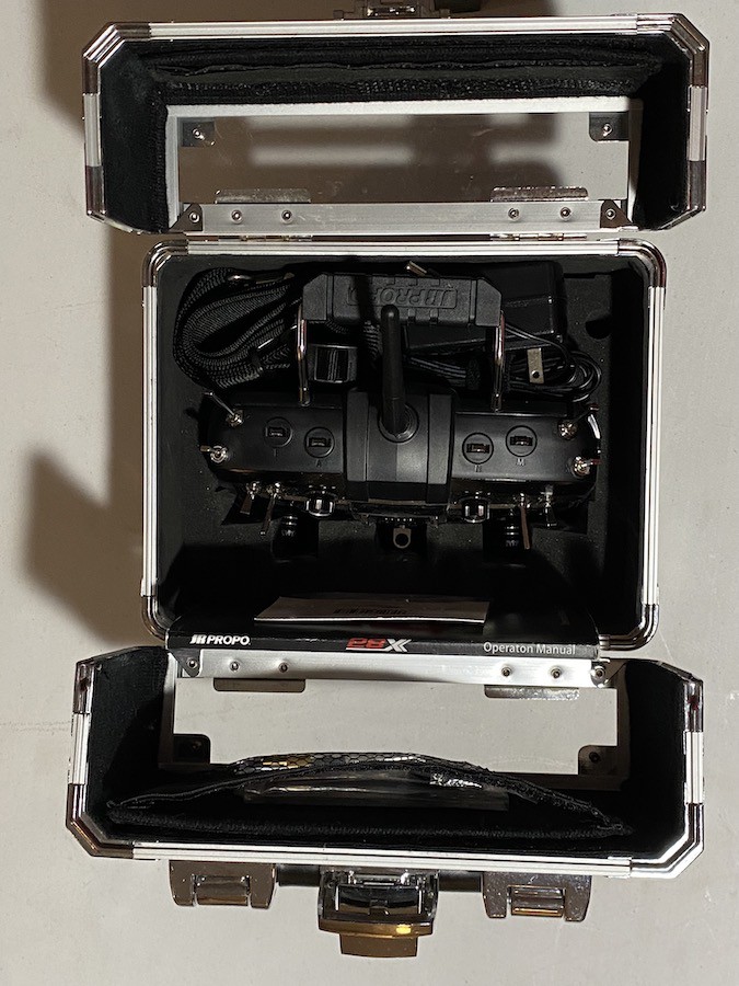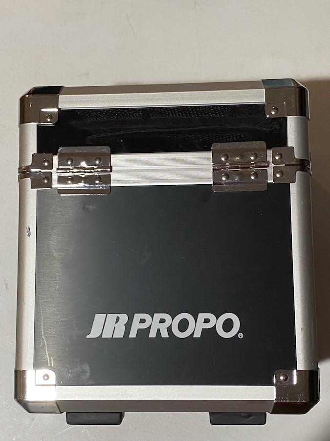 The protective plastic covers and protective plastic screen cover are still on as originally shipped from JR. Transmitter has no scratches or blemishes and is fully functional. Software updated to ver.2. Includes original accesories, manual, SD memory card, 2 internal batteries, and charger. The case has some various minor scratches and blemishes.