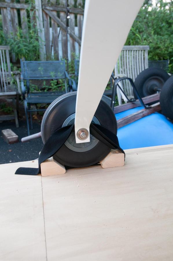 I found some great foam pad at EMS that is used as a sleeping pad underneath sleeping bags. The pad is 6' long and about 24" wide, good density, but it will absorb pressure well. This will be contact cemented to the PVC cradles once the shape and size of each is finalized. On the rear mount I'll have side flaps come out to wrap around the fuselage and protect it from the velcro strap (no need for the on the center mount as the velcro goes through the wing root and the front support doesn't use velcro).