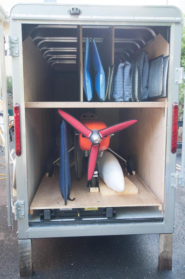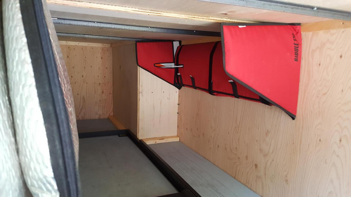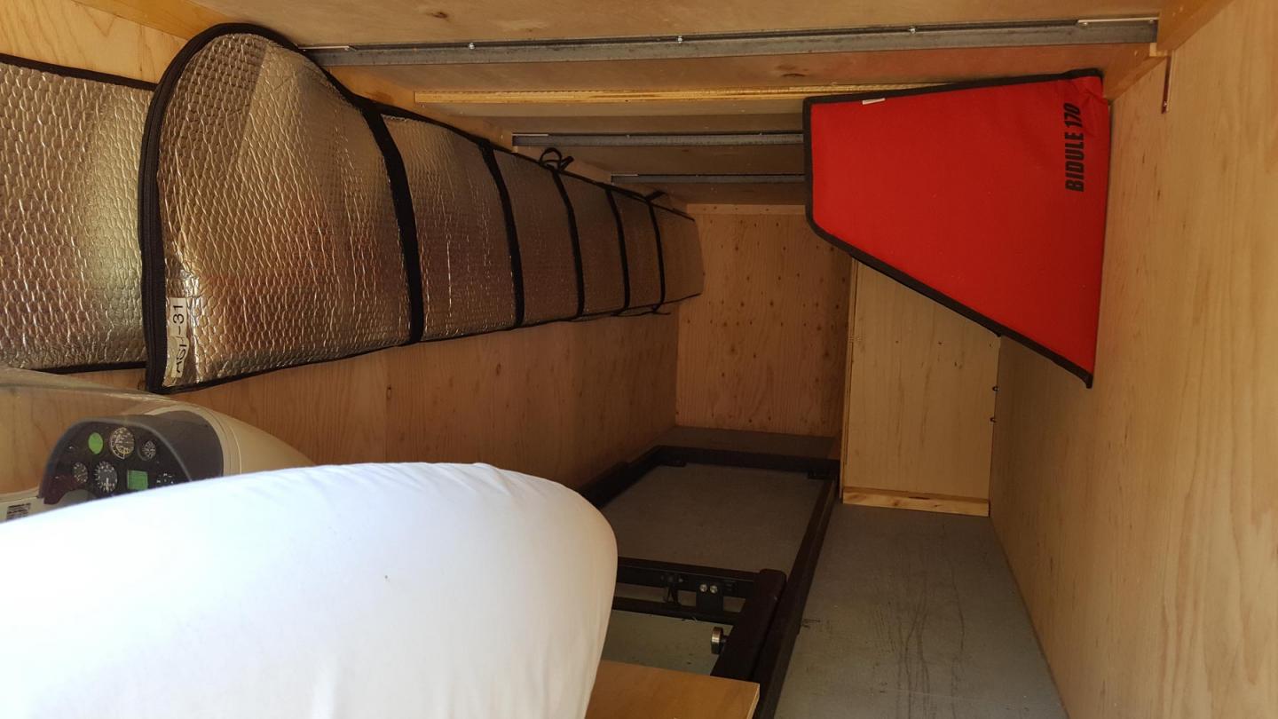Got the partitions in for the main wing panels up on the top shelf. 2 dividers....shorter panels on the far right that are 8' long or less and longer panels up to about 11' 9" in the middle. The far left side is for the fuselage plank that will hold the Arcus and Fox fuselages for now.....easy enough to change out the mounts for different fuselages up to about 11' 9" in length there (the width of that section is about 16" wide, so just about any fuselage or pair of smaller fuselages will fit, or it can be used for more wing panels if needed).