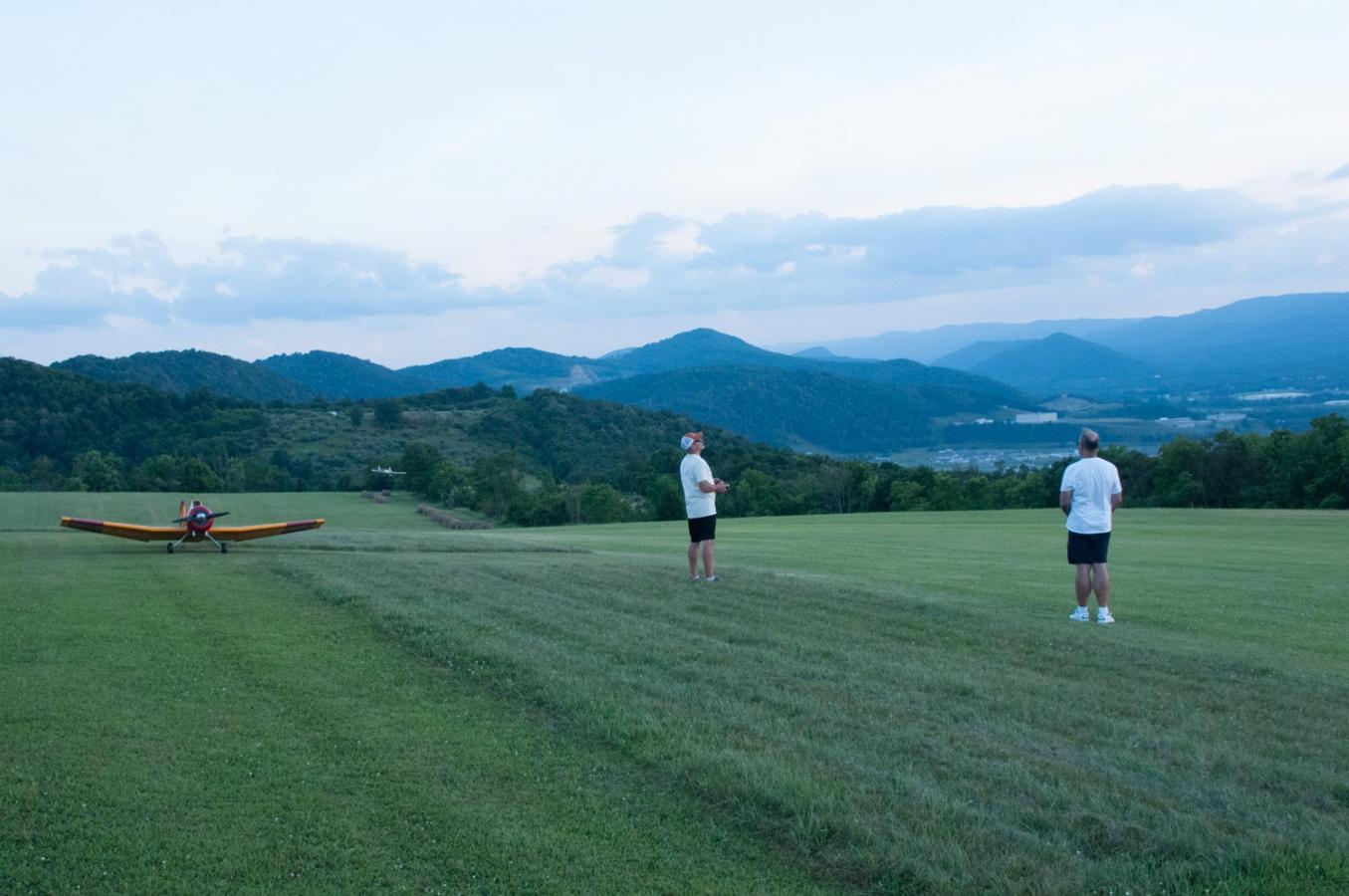 Here are a couple of pictures from last night as it was getting close to sunset....Steve and Len getting some flying in. Steve towing the Bidule and Len flying his Swift.