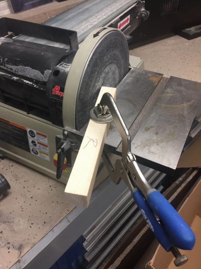 2) Clamp a straight block of wood to your disc sander table. ( you do have a disc sander, right?) Click image for larger version  Name:	1 - 3.jpg Views:	1 Size:	50.5 KB ID:	22079
