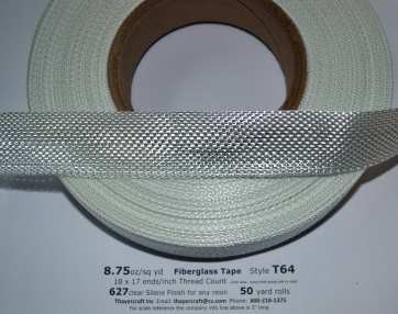 Style T64, 8.75 oz/sq yd fiberglass cloth tape details and prices for 1" wide in 1, 2, 3, 4 or 5 50 yard rolls from thayercraft.com