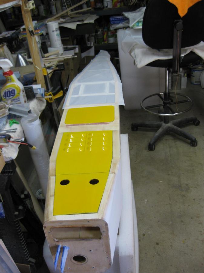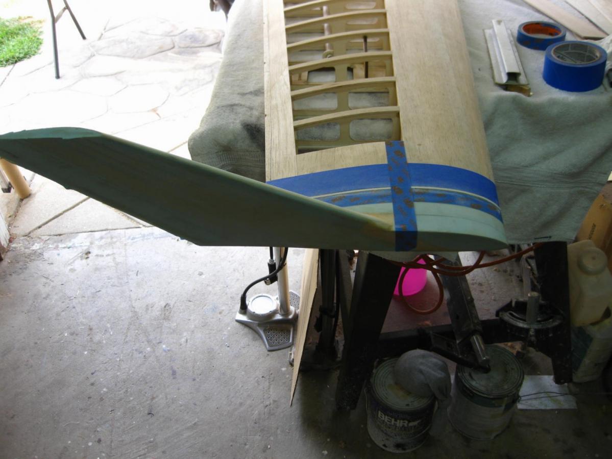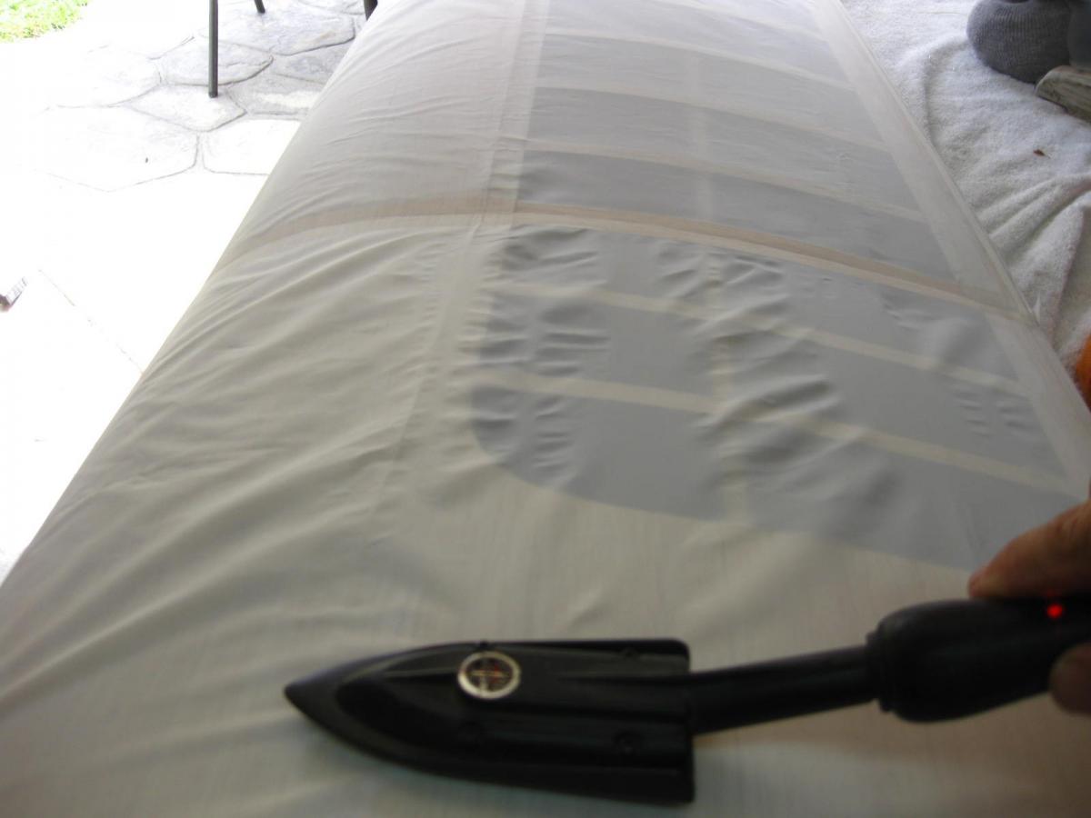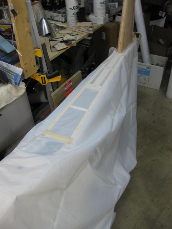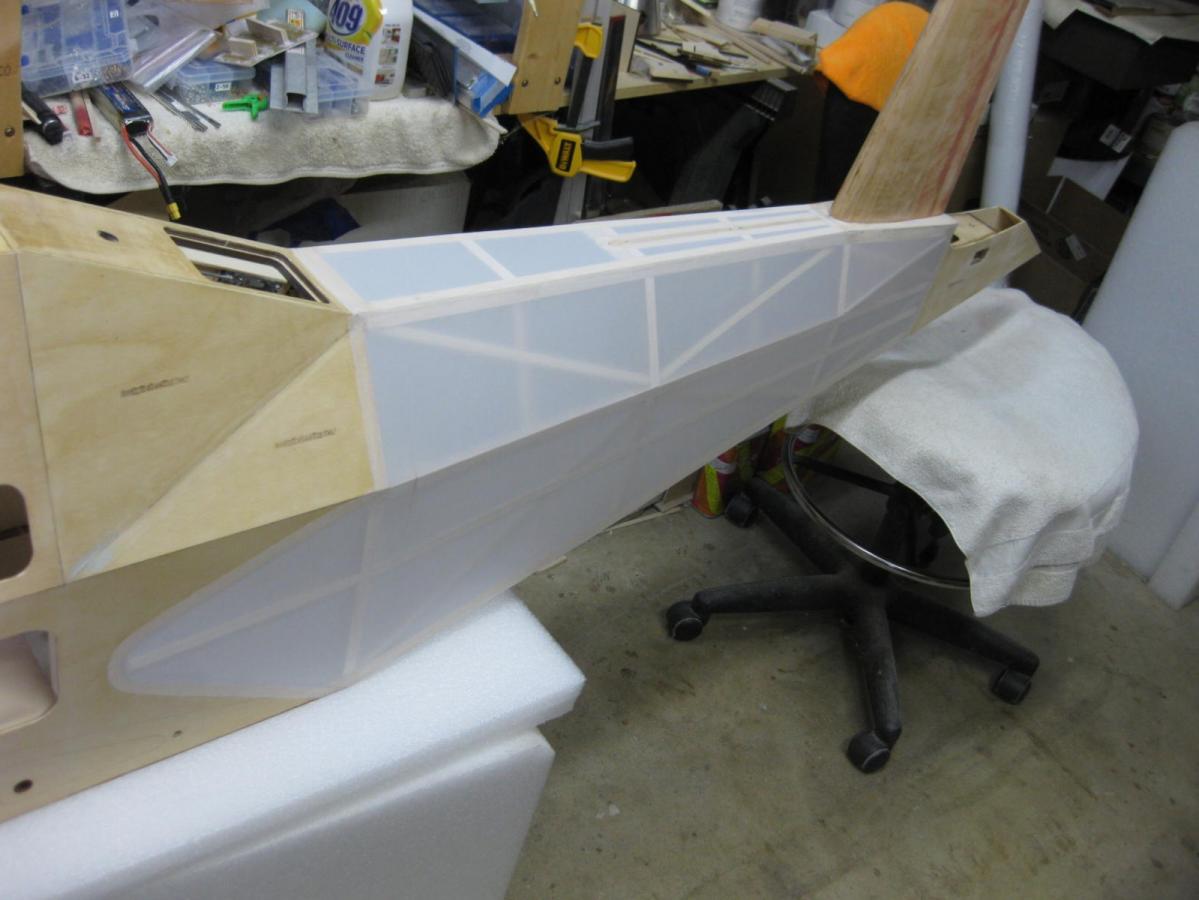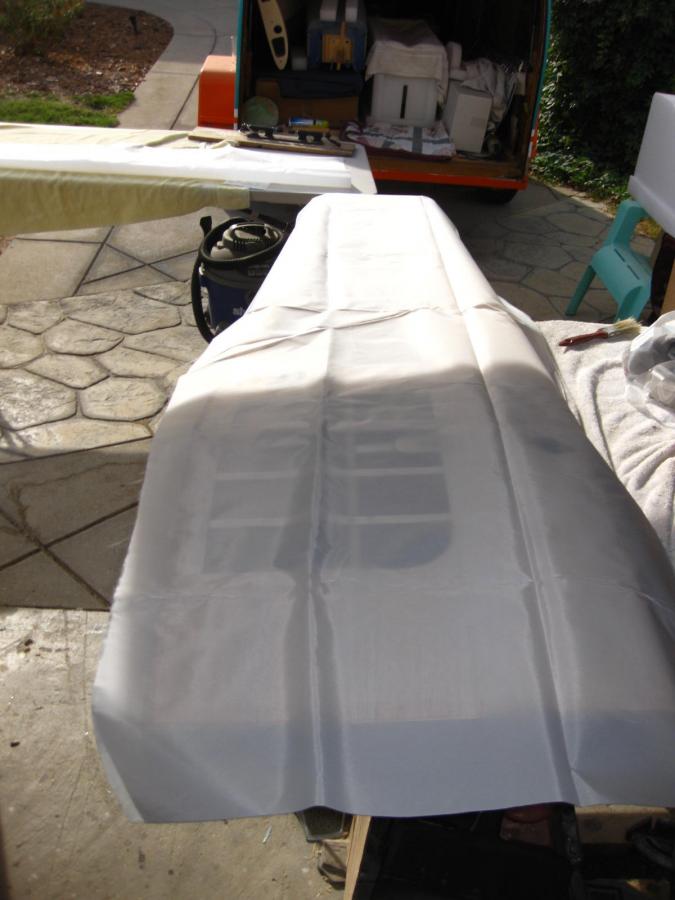 Modified Stits lite process begins - modified as in the PolyTak is thinned 3:1 and then two coats are brushed on to the surfaces that you want to glue down. Then fabric is glued down by passing a paper towel saturated with Polyfiber thinner over the fabric laying on the coated surface.