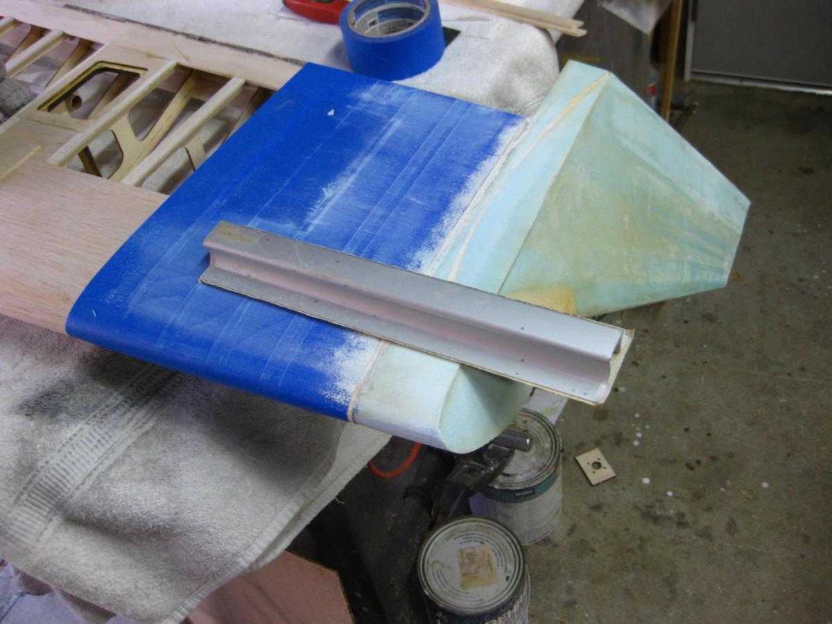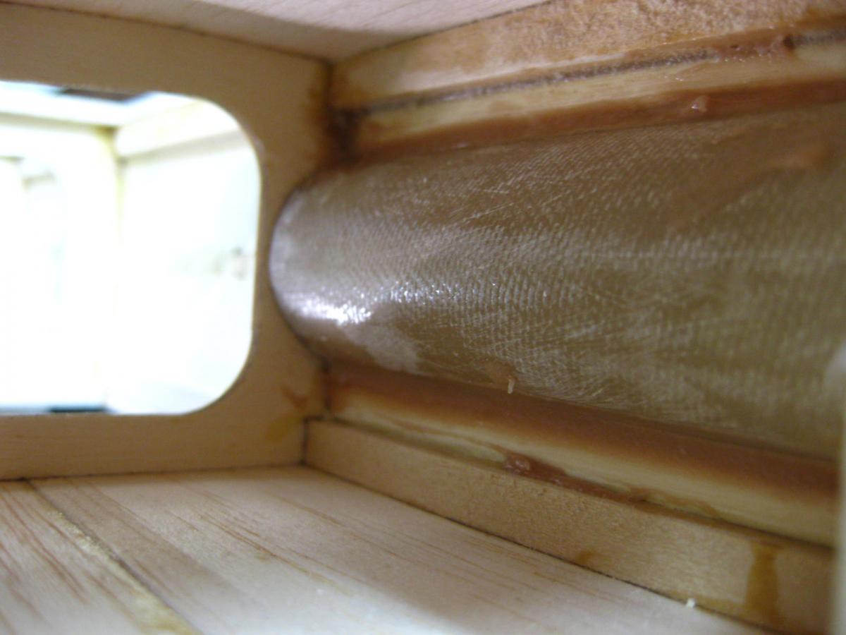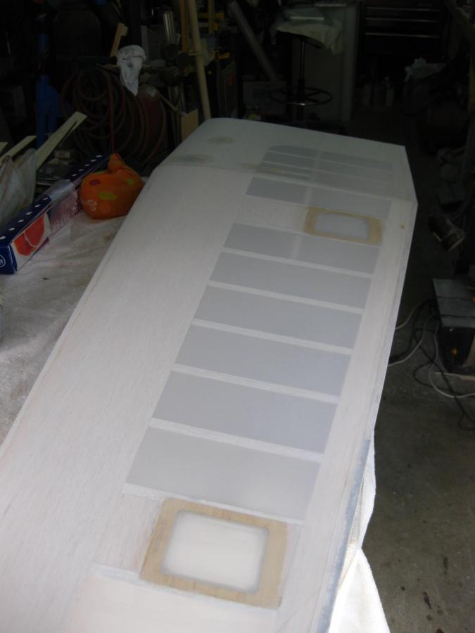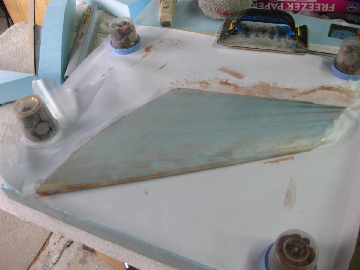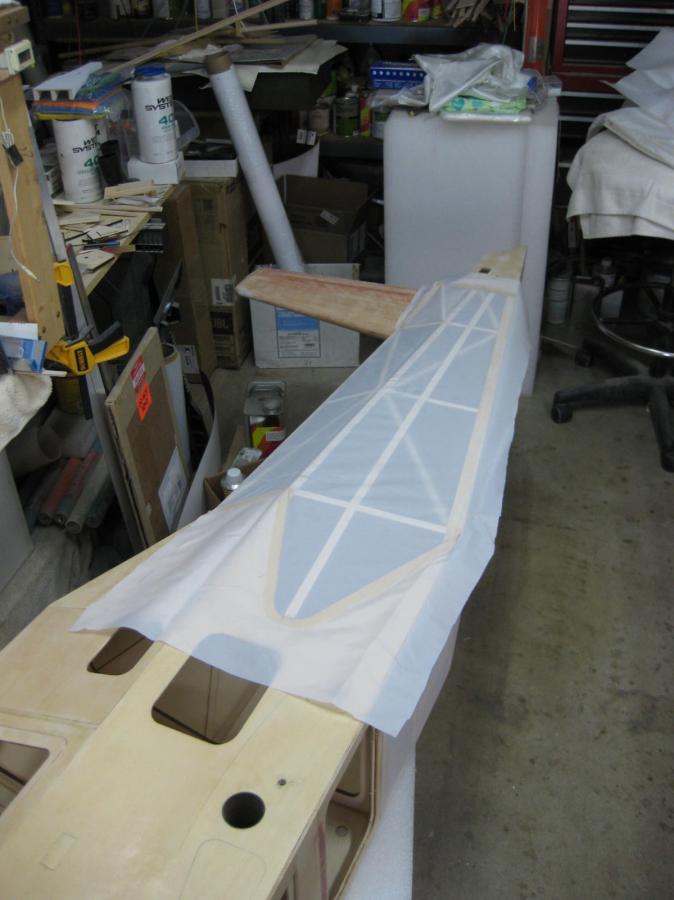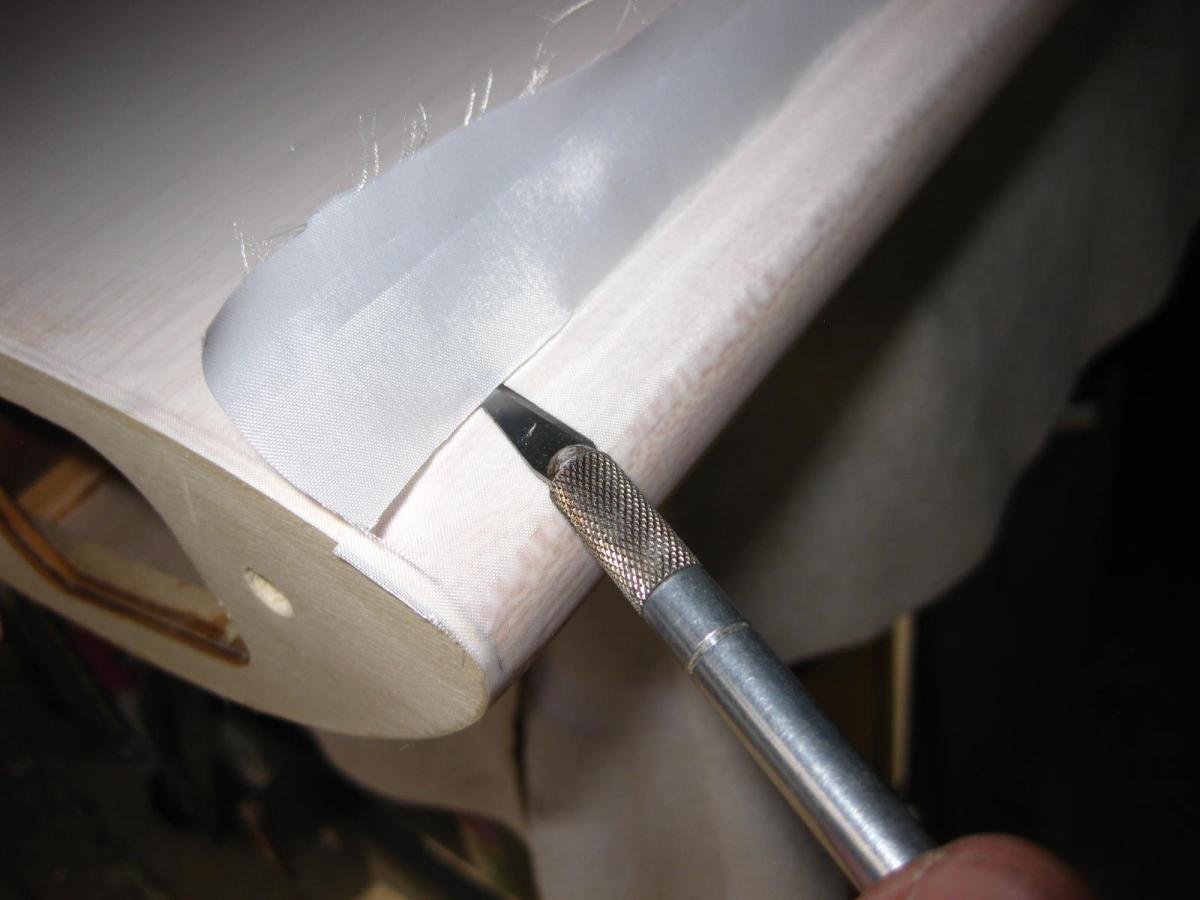 Modified Stits lite process begins - modified as in the PolyTak is thinned 3:1 and then two coats are brushed on to the surfaces that you want to glue down. Then fabric is glued down by passing a paper towel saturated with Polyfiber thinner over the fabric laying on the coated surface.