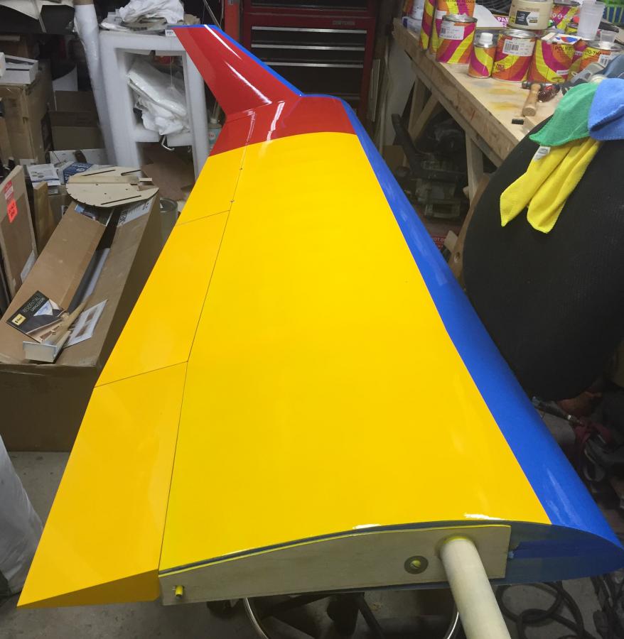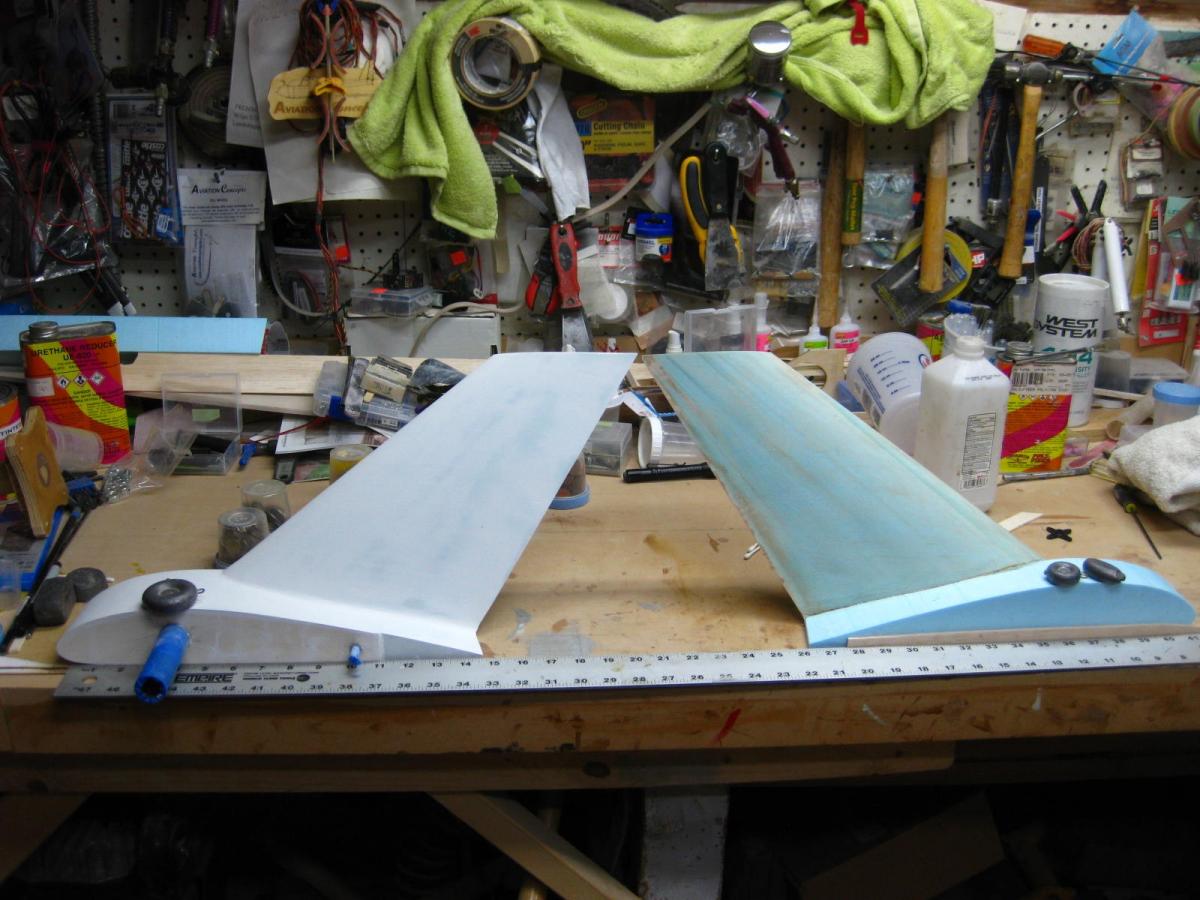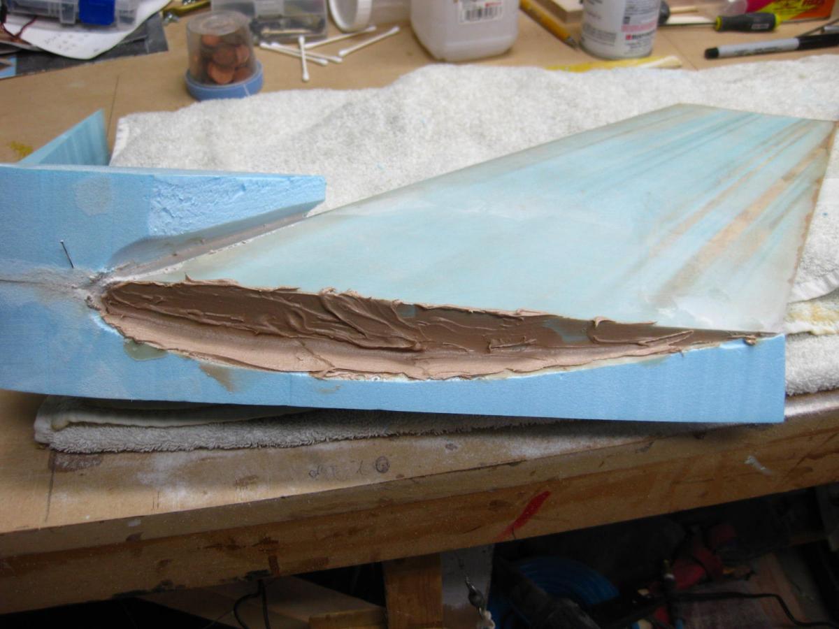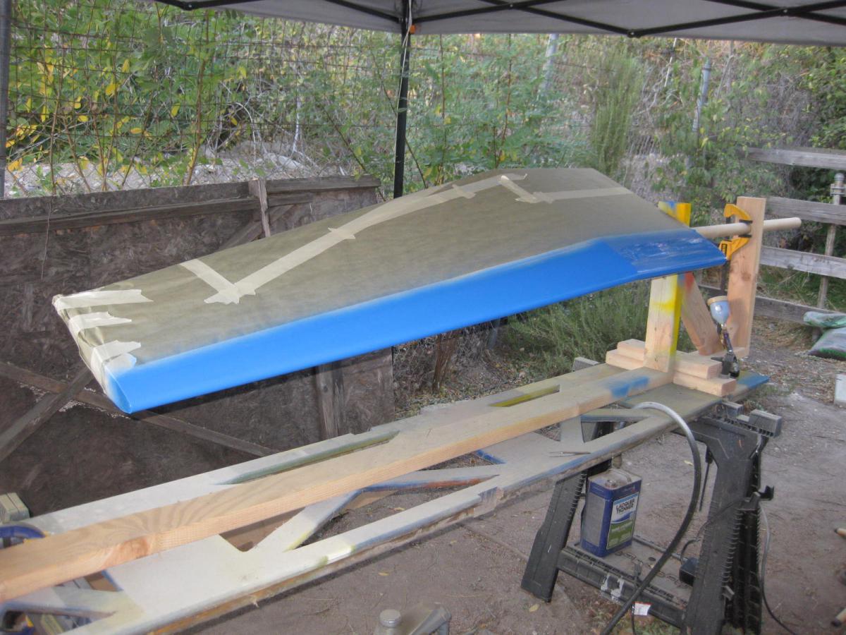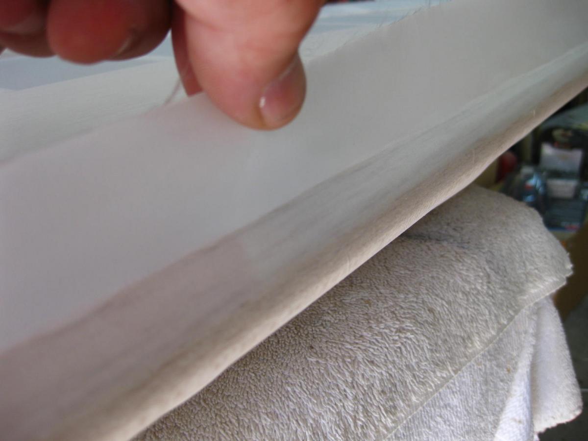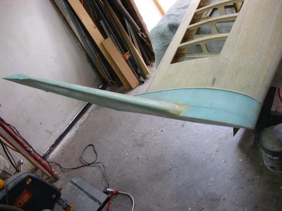 Modified Stits lite process begins - modified as in the PolyTak is thinned 3:1 and then two coats are brushed on to the surfaces that you want to glue down. Then fabric is glued down by passing a paper towel saturated with Polyfiber thinner over the fabric laying on the coated surface.