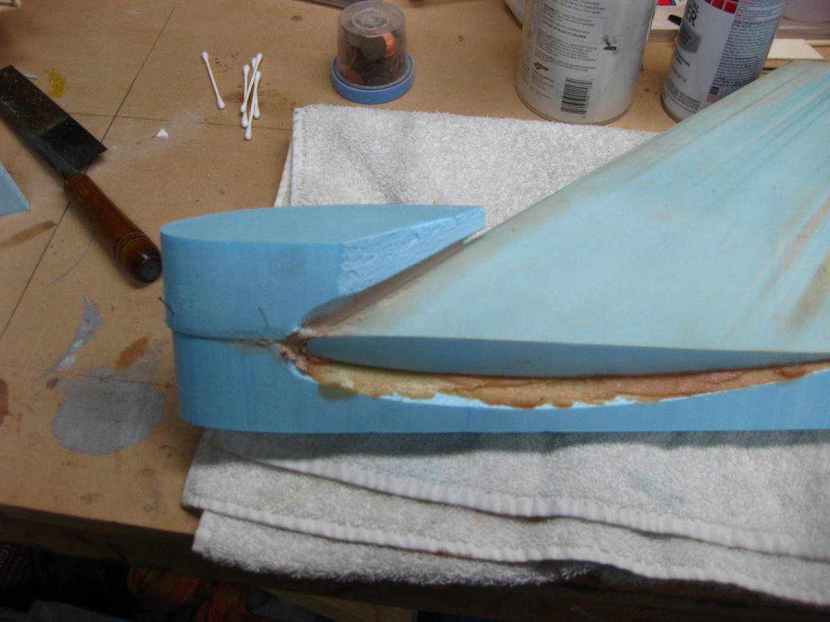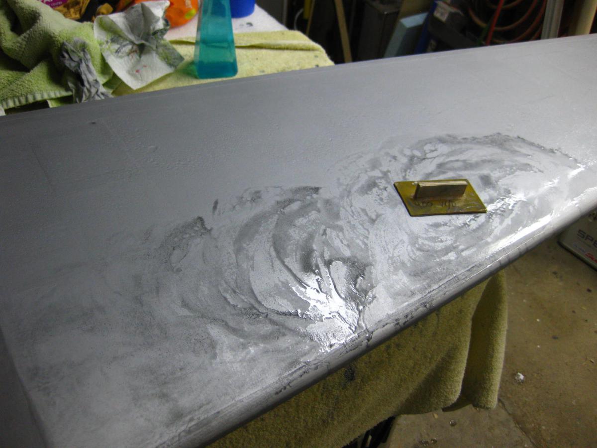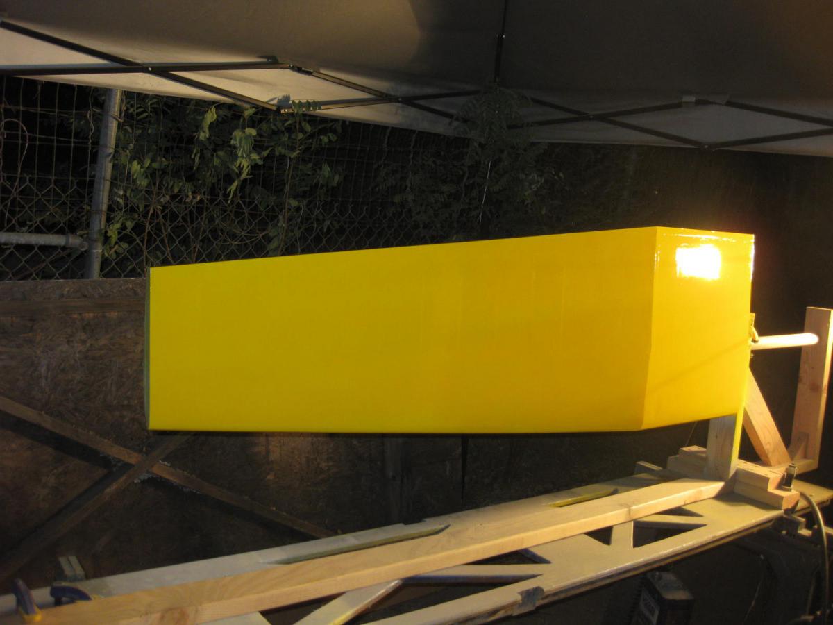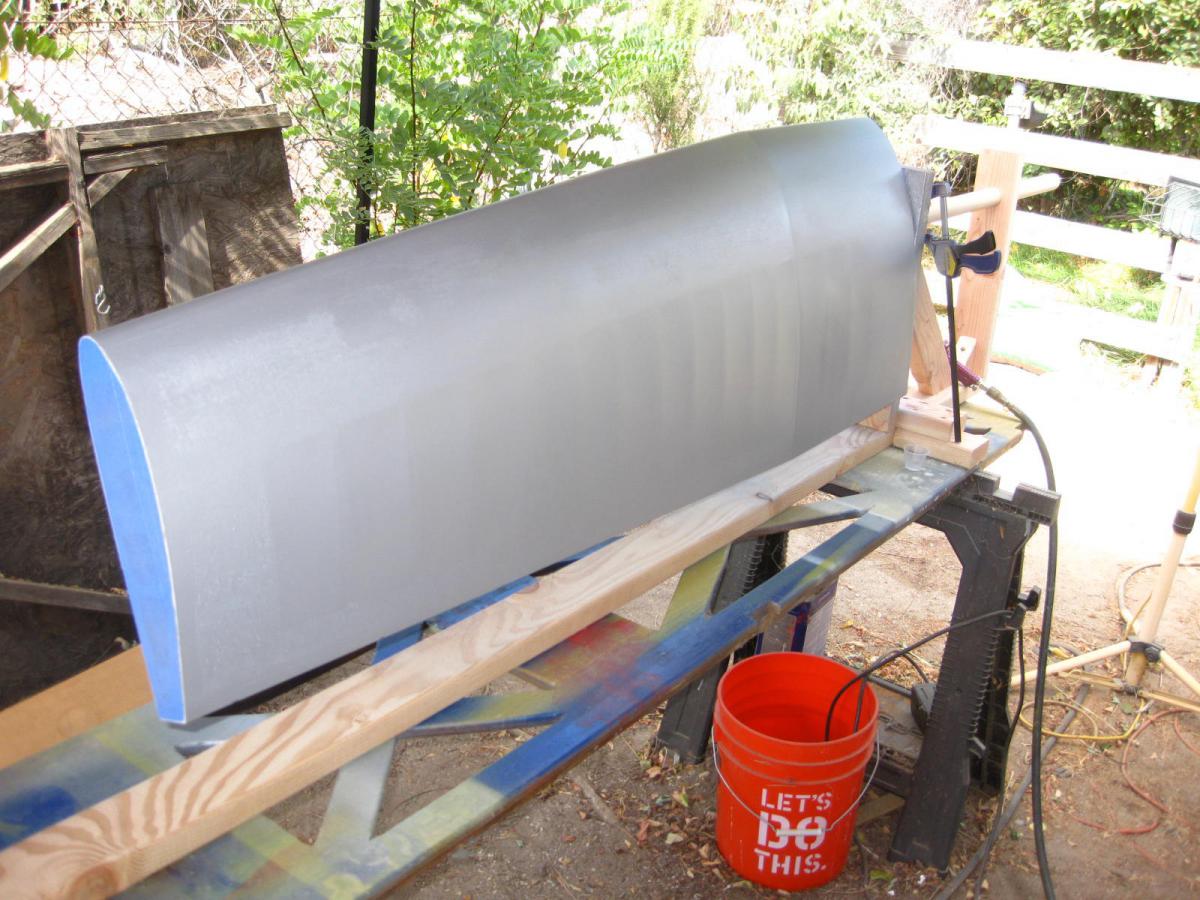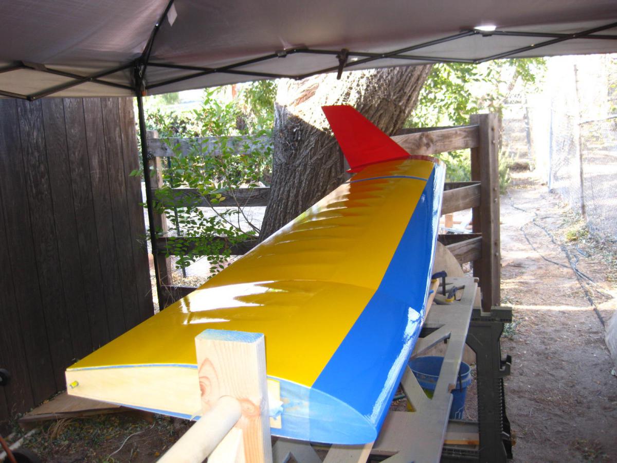 Modified Stits lite process begins - modified as in the PolyTak is thinned 3:1 and then two coats are brushed on to the surfaces that you want to glue down. Then fabric is glued down by passing a paper towel saturated with Polyfiber thinner over the fabric laying on the coated surface.