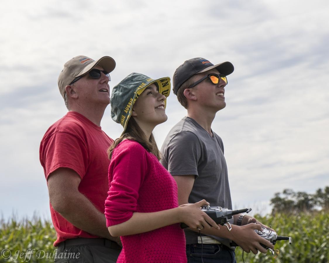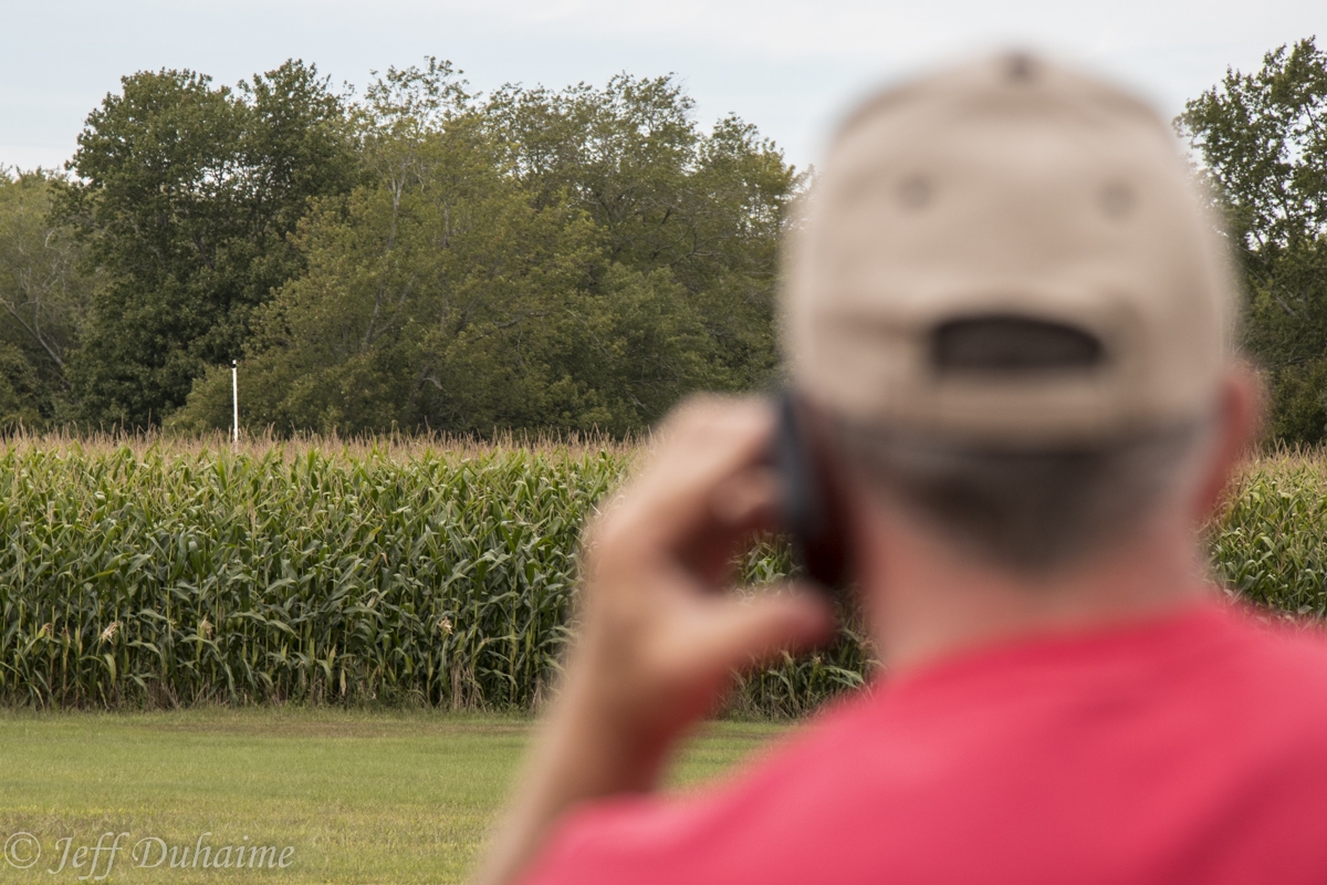 Now the one of Scott on his cell phone (back to camera) is also worth noting for a good (I thought) aircraft locating technique. Notice in the picture to his left is a white pole sticking out of the corn. The pole is attached to Dan with his phone. Scott had a line of sight on where the plane went into the corn from where he is standing. As Dan is walking through the corn, Scott is directing him (the pole) left or right to stay on the line to the plane.